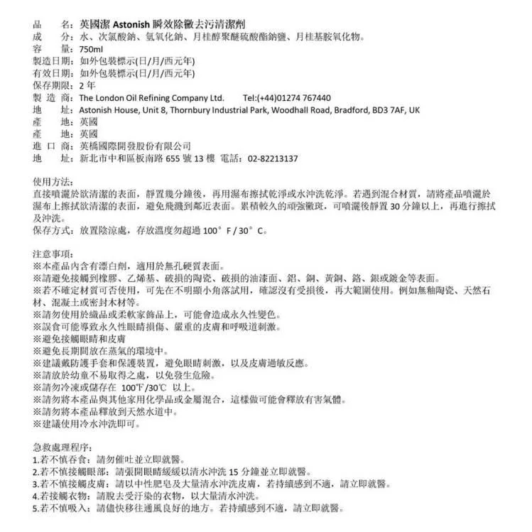 【Astonish】英國潔瞬效除黴去汙清潔劑1瓶(750mlx1)
