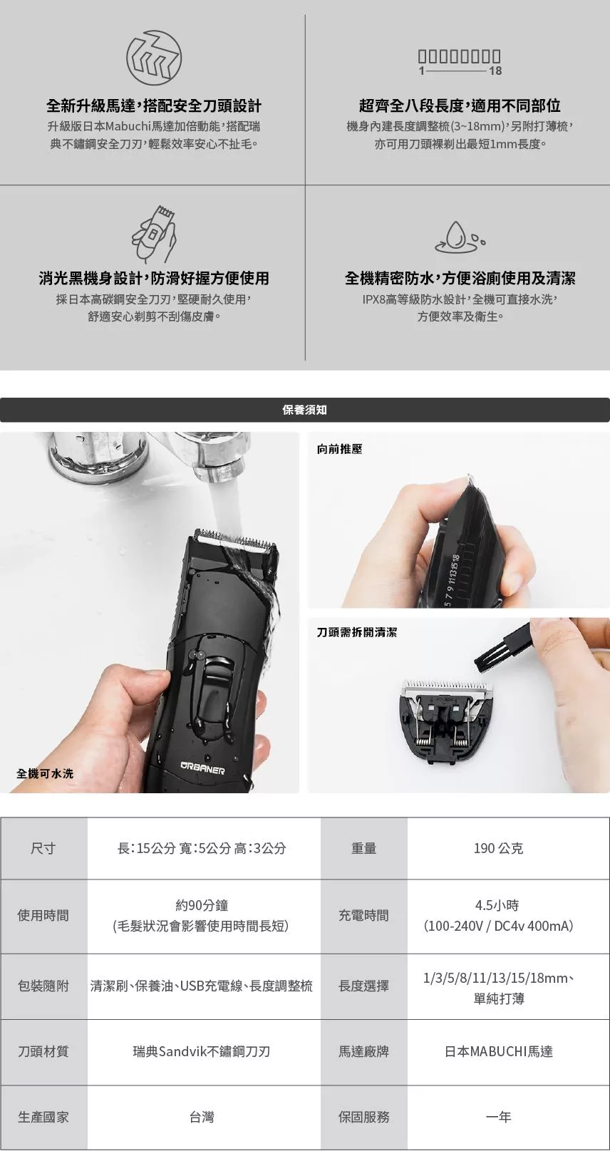 【URBANER奧本】MB-333B 奧本頂級水洗充電式電動理毛器/理髮器/剪頭髮/剃髮/除毛刀