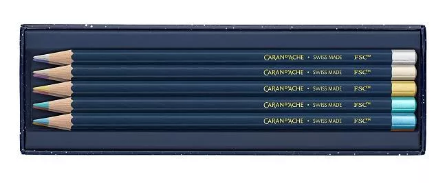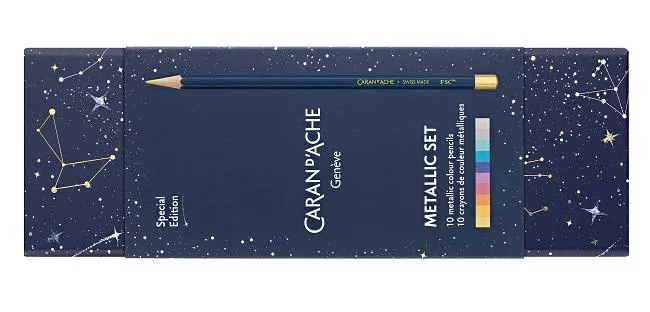 本系列同時推出兩款美術套裝組。10支金屬色系色鉛筆組,筆身以深藍色裝飾;