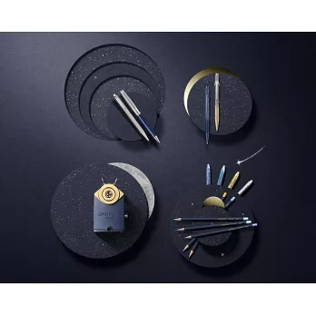 兩款經典849 原子筆航向太空之旅,金屬筆身經過獨特的技術工藝,呈現月球般的外觀,並飾以星空藍或金色的漸層。