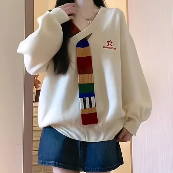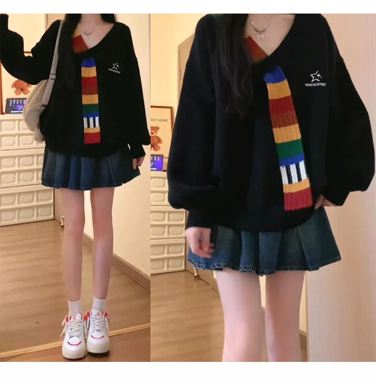 【MsMore】 美式復古彩虹毛織拼接V領針織衫長袖寬鬆學院風毛衣短版上衣# 123409 FREE 黑色
