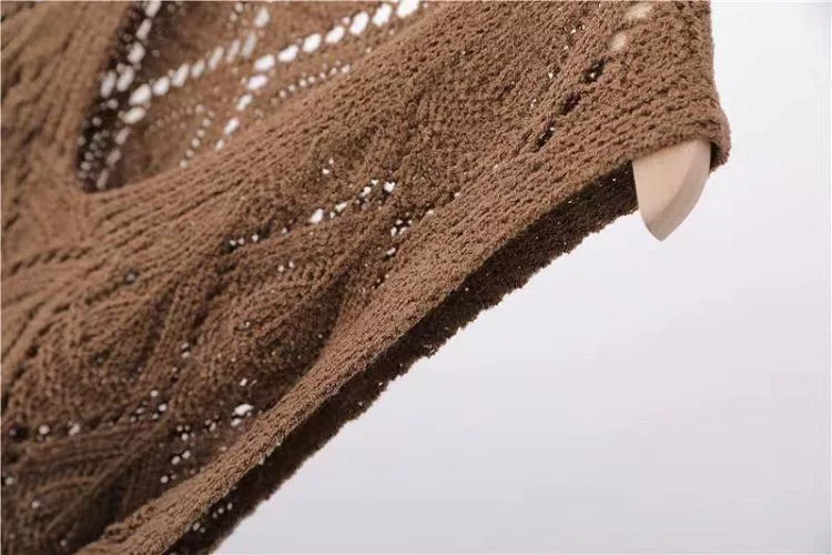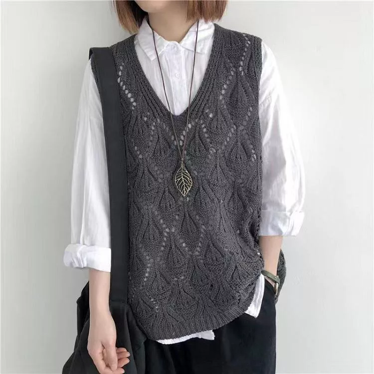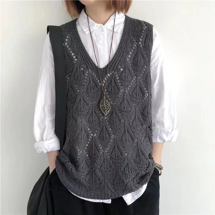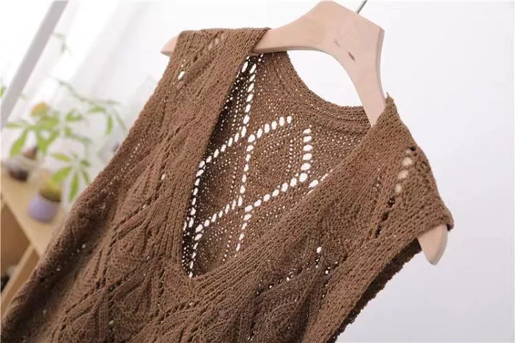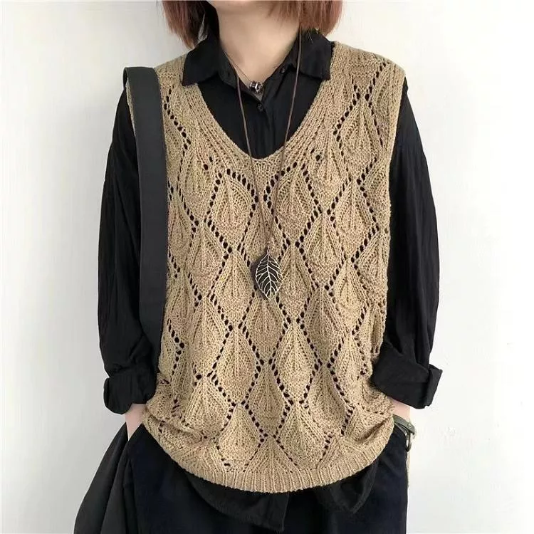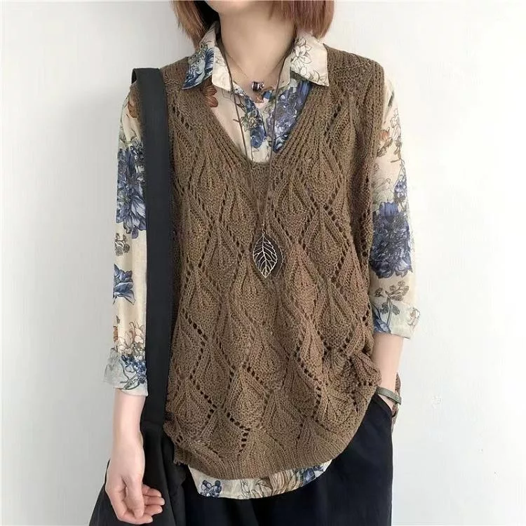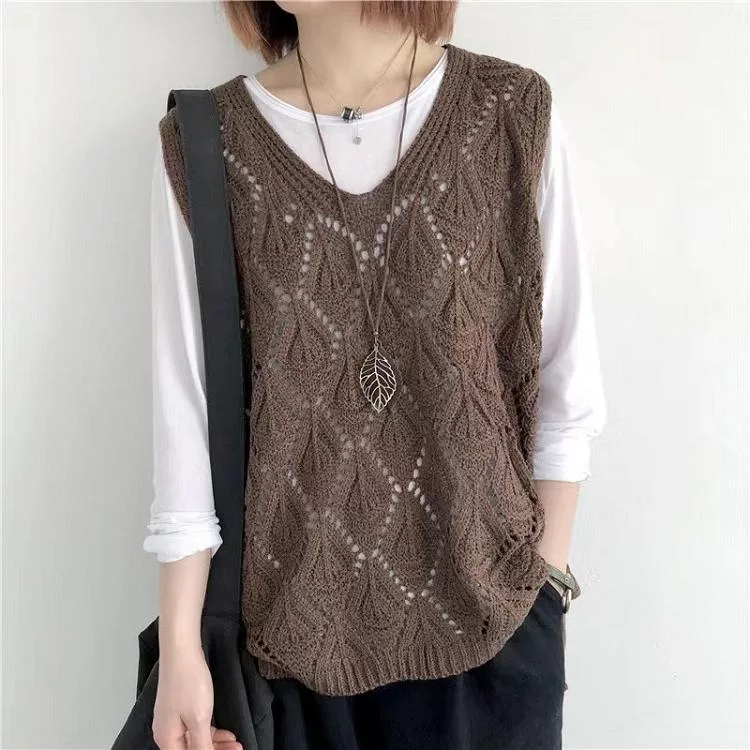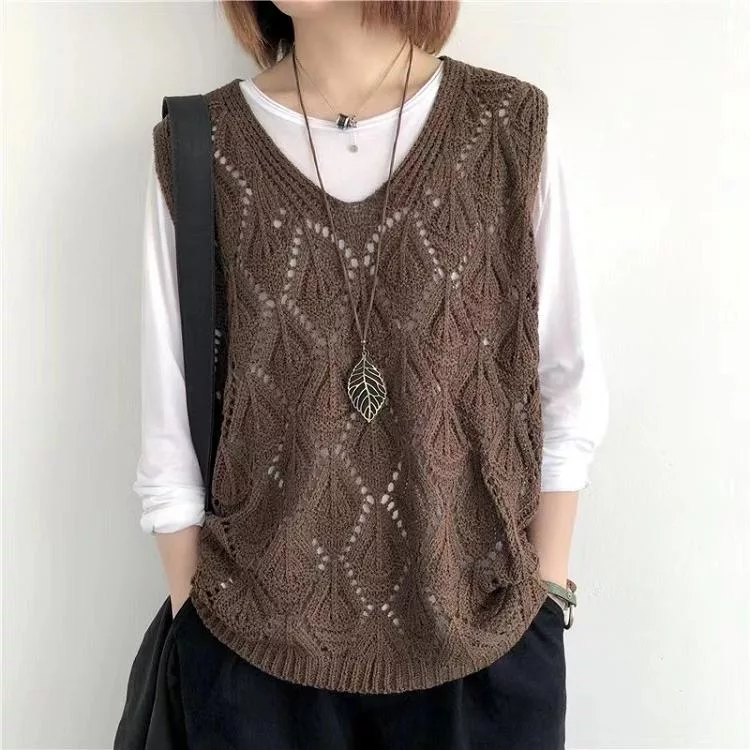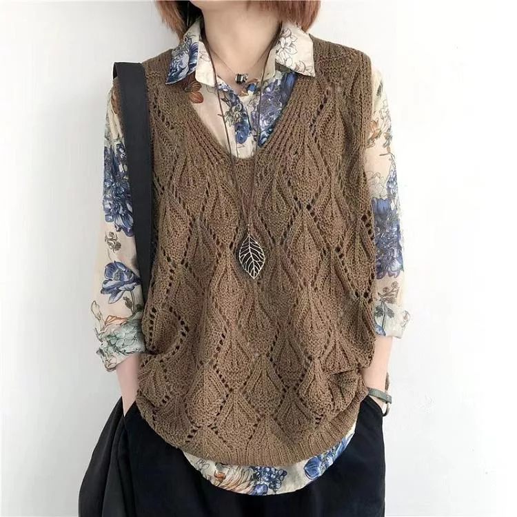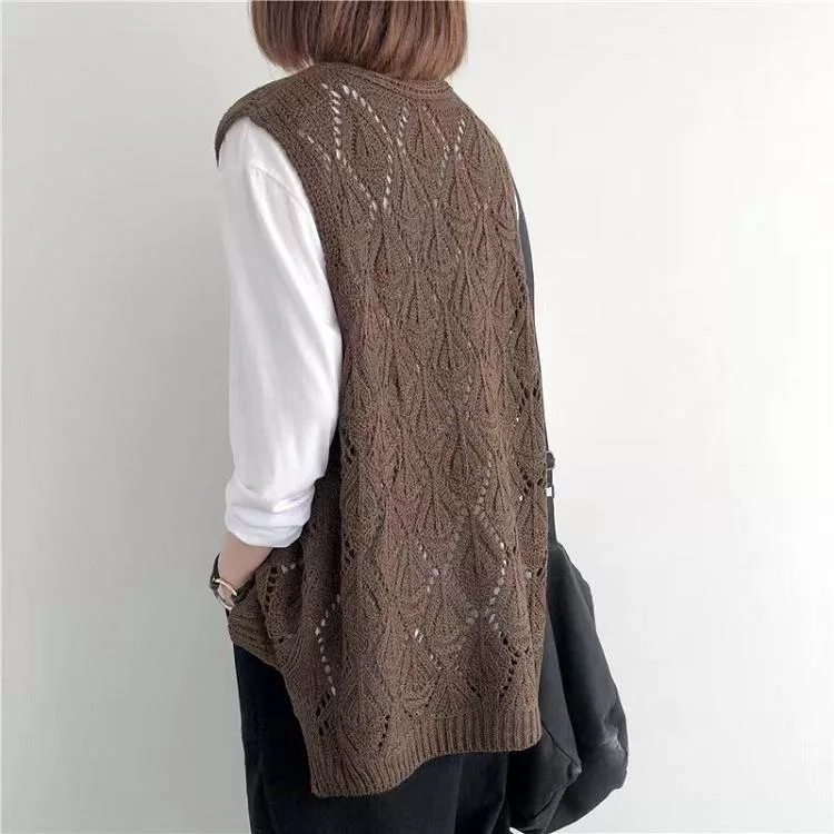 【慢。生活】復古V領鉤花針織無袖背心上衣女寬鬆鏤空套頭馬甲 103  FREE 咖啡色