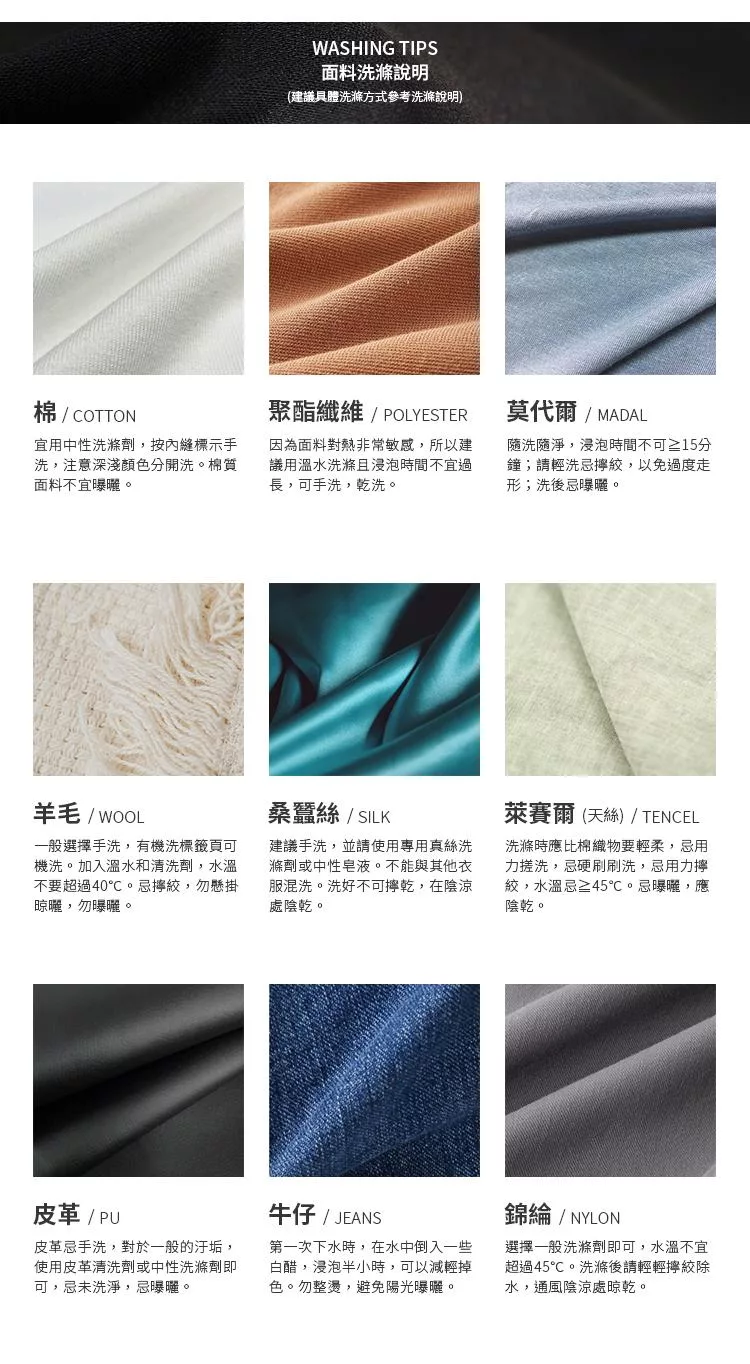 ●可水洗晾乾,不能使用冷洗精、柔軟精及漂白水,不能乾洗
