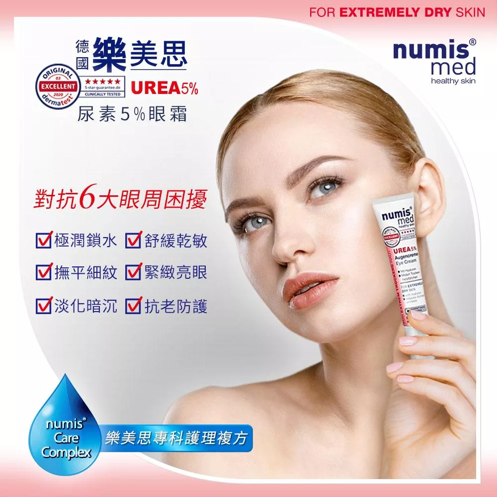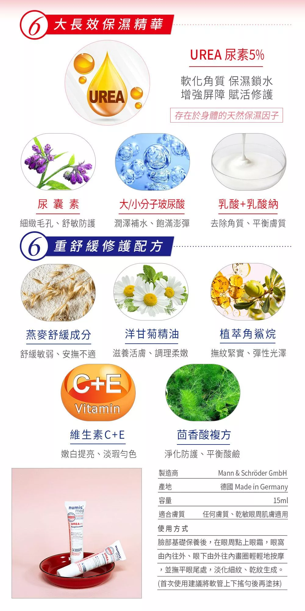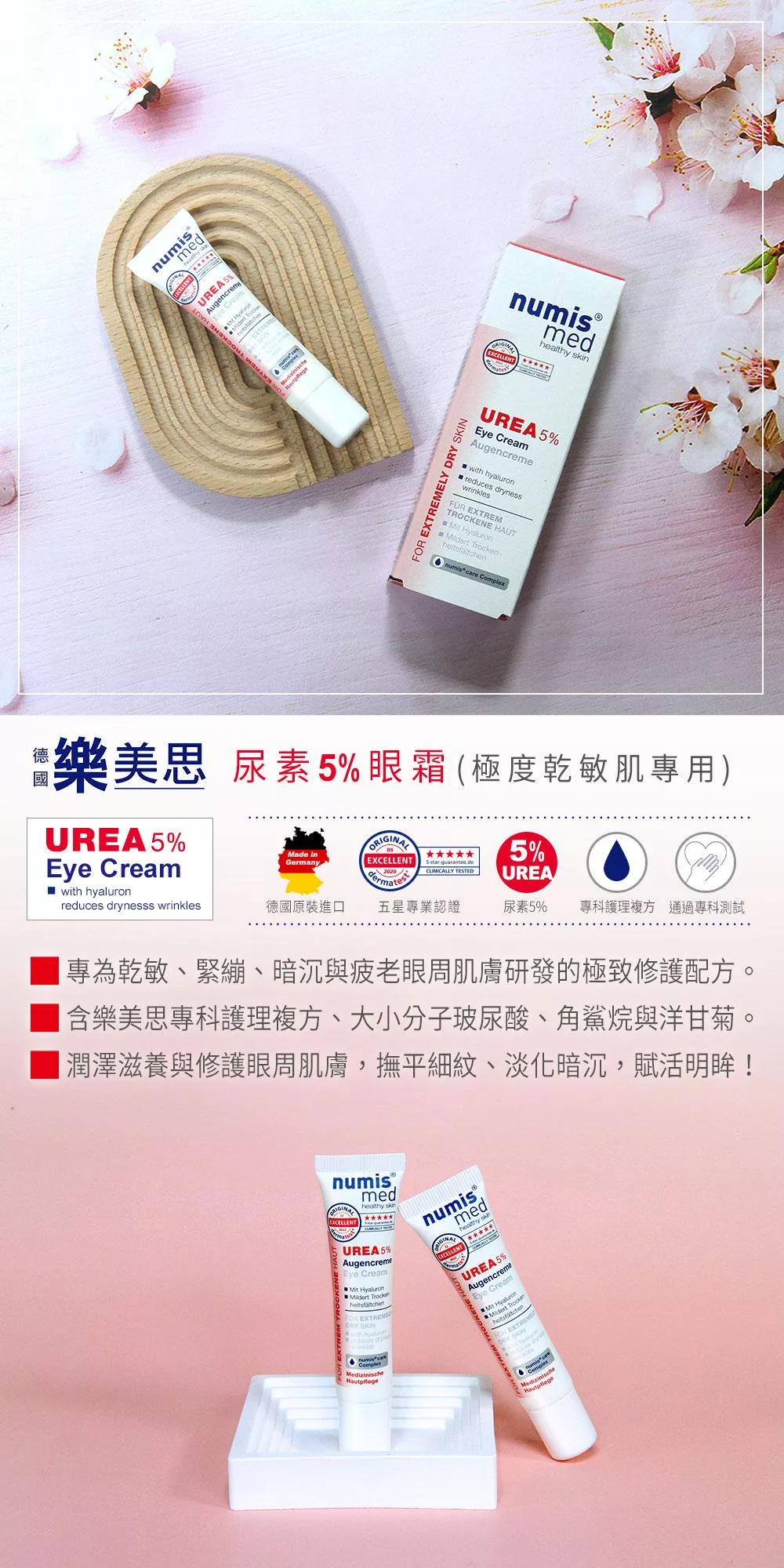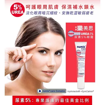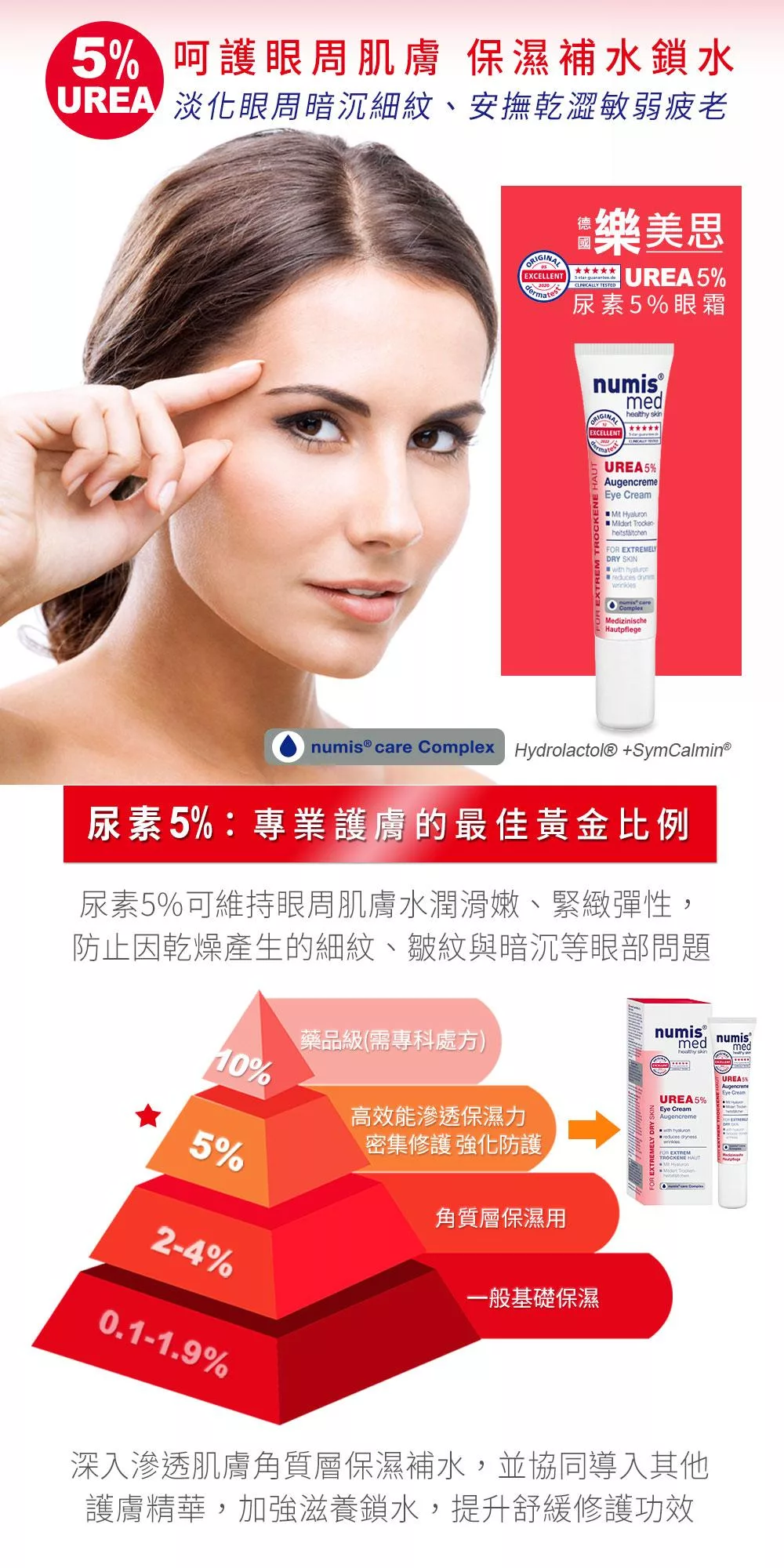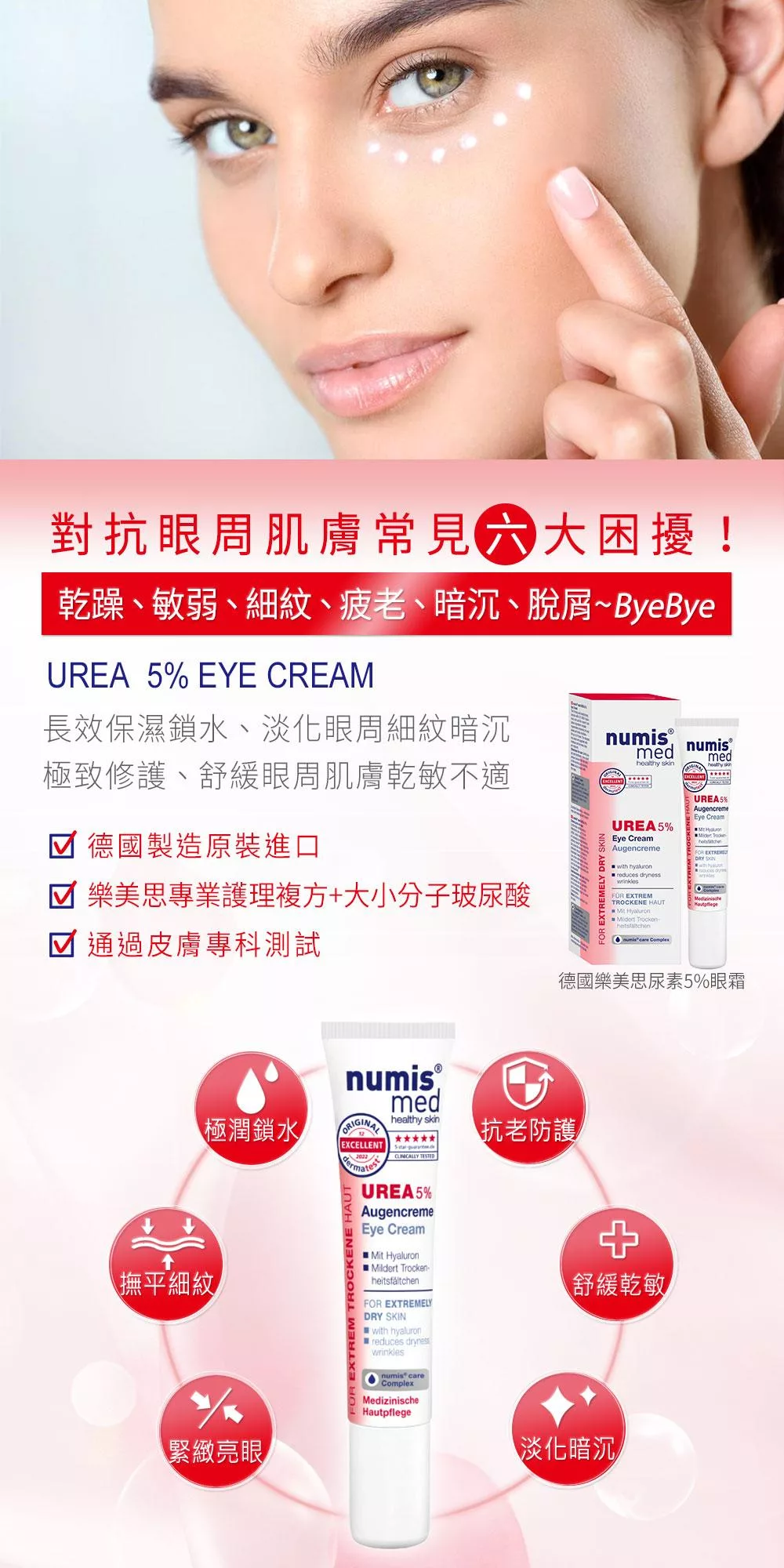 尿素5%可維持眼周肌膚水潤,滑嫩、緊緻彈性,防止因乾燥產生的細紋、皺紋與暗沉等眼部問題。