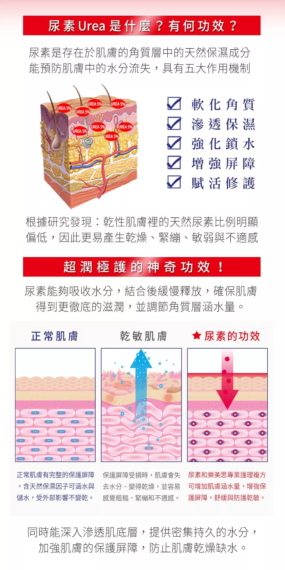尿素能夠深入肌膚補足水分,讓肌膚恢復水嫩更加有彈性。