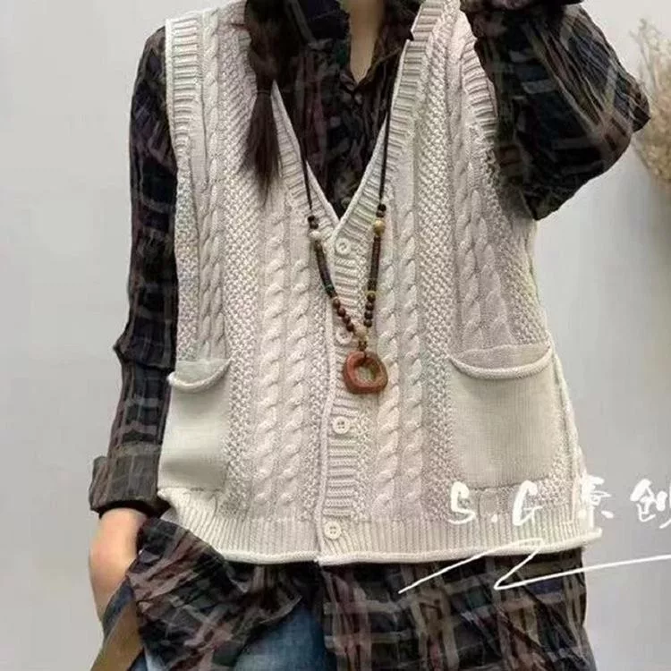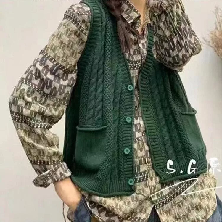 【慢。生活】V領棉線背心女開衫外穿復古文藝風麻花馬甲 0302  FREE 綠色