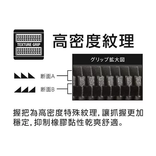 握把為高密度特殊紋理,讓抓握更加穩定,抑制橡膠黏性乾爽舒適