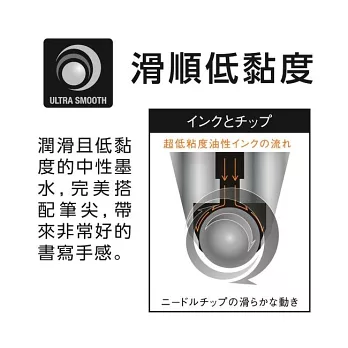 全新開發潤滑且低黏度的中性墨水,完美搭配筆尖,帶來非常好的書寫手感