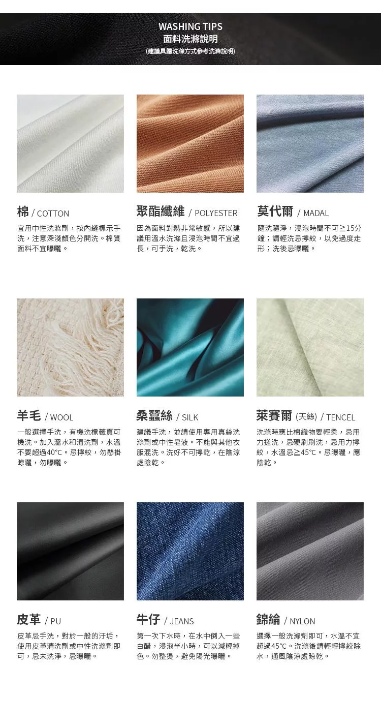 ●可水洗晾乾,不能使用冷洗精、柔軟精及漂白水,不能乾洗