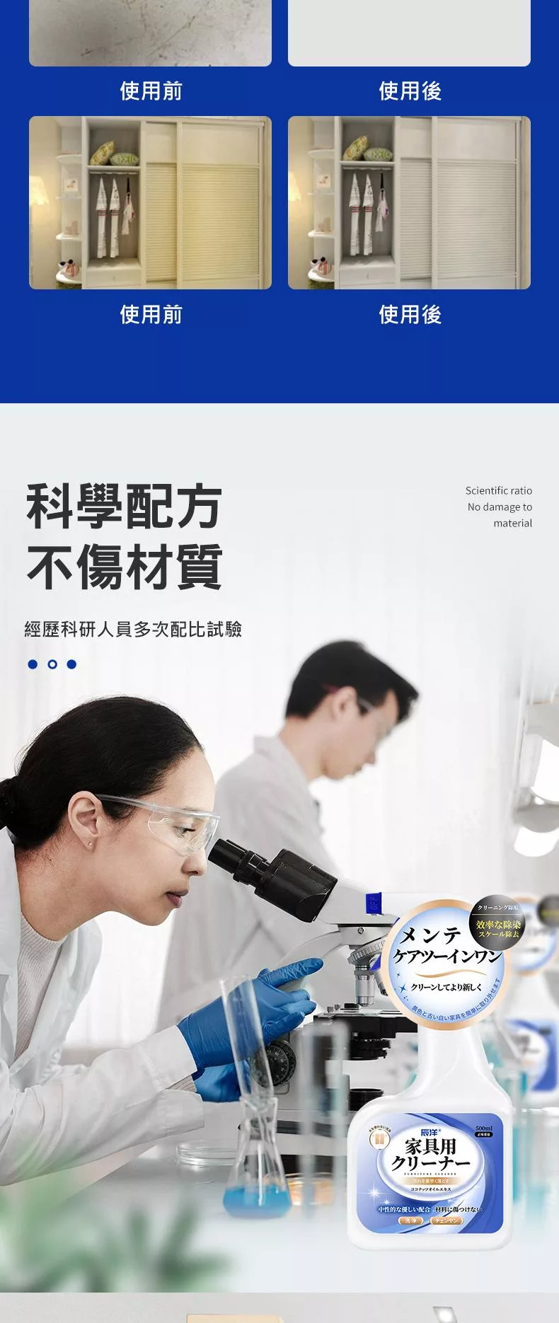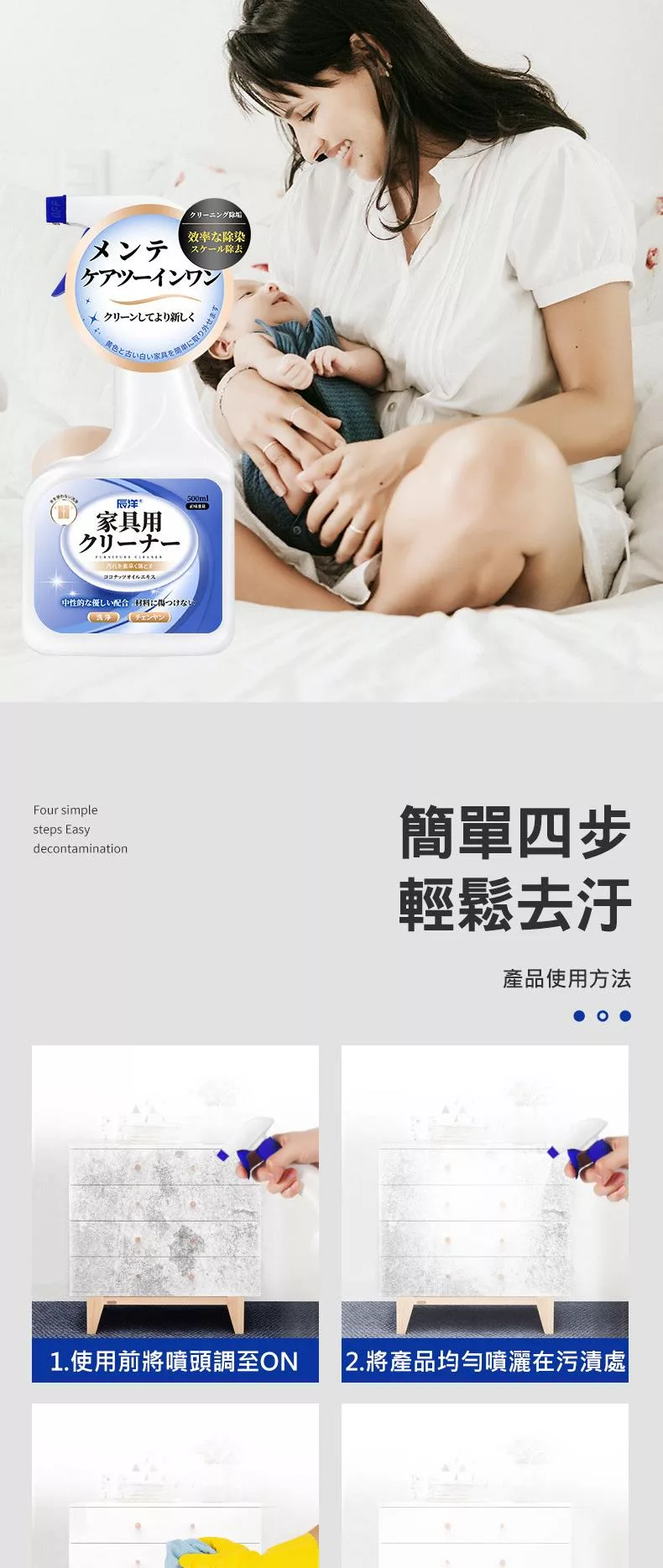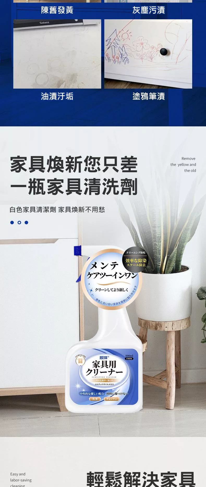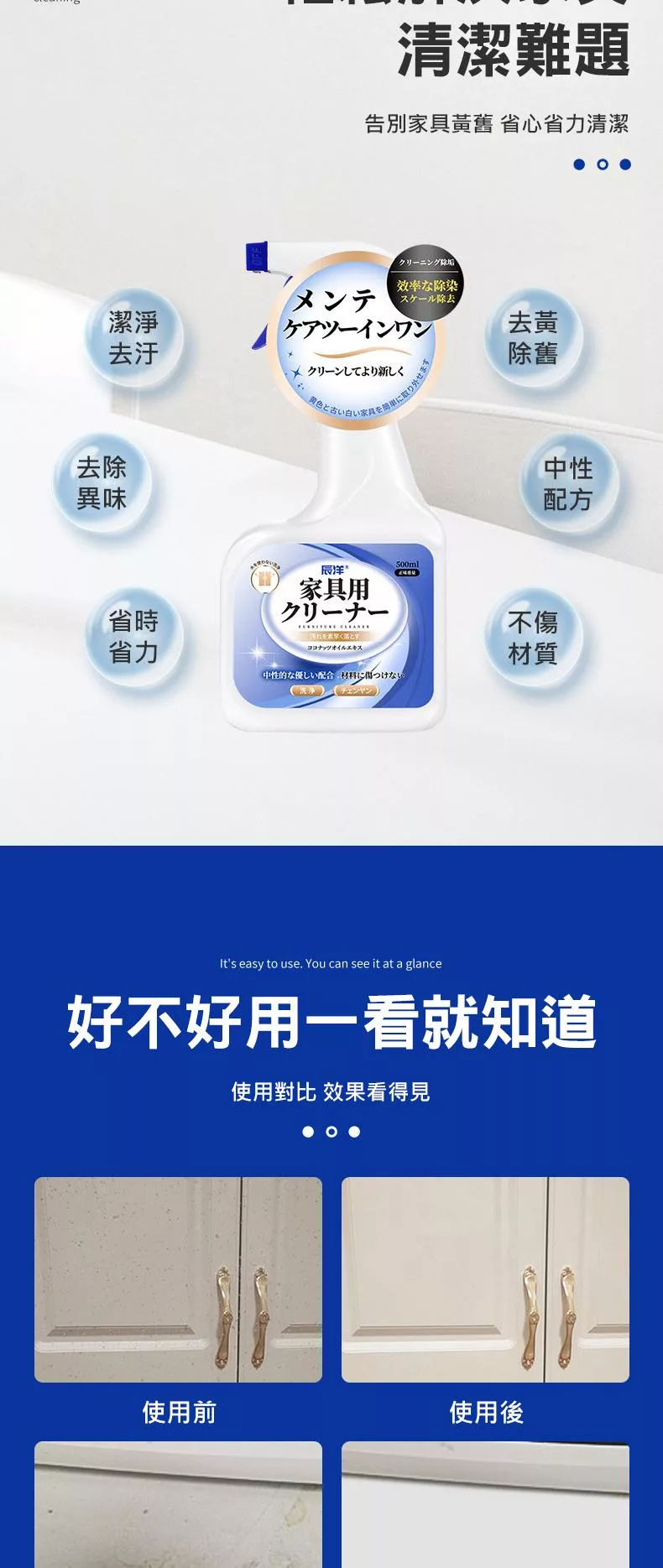 2.本產品為中性清潔劑、無法解決染色、刮痕、陳年污漬及氧化發黃問題。