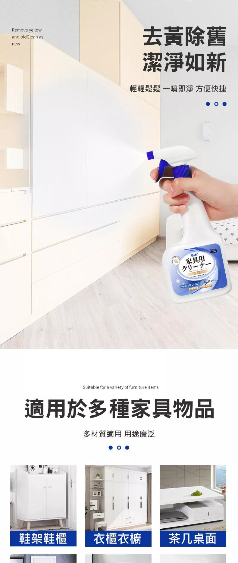 適用木質、木製家具、皮質、塑料、漆面、茶几、房門、鞋櫃等表面的各種清潔