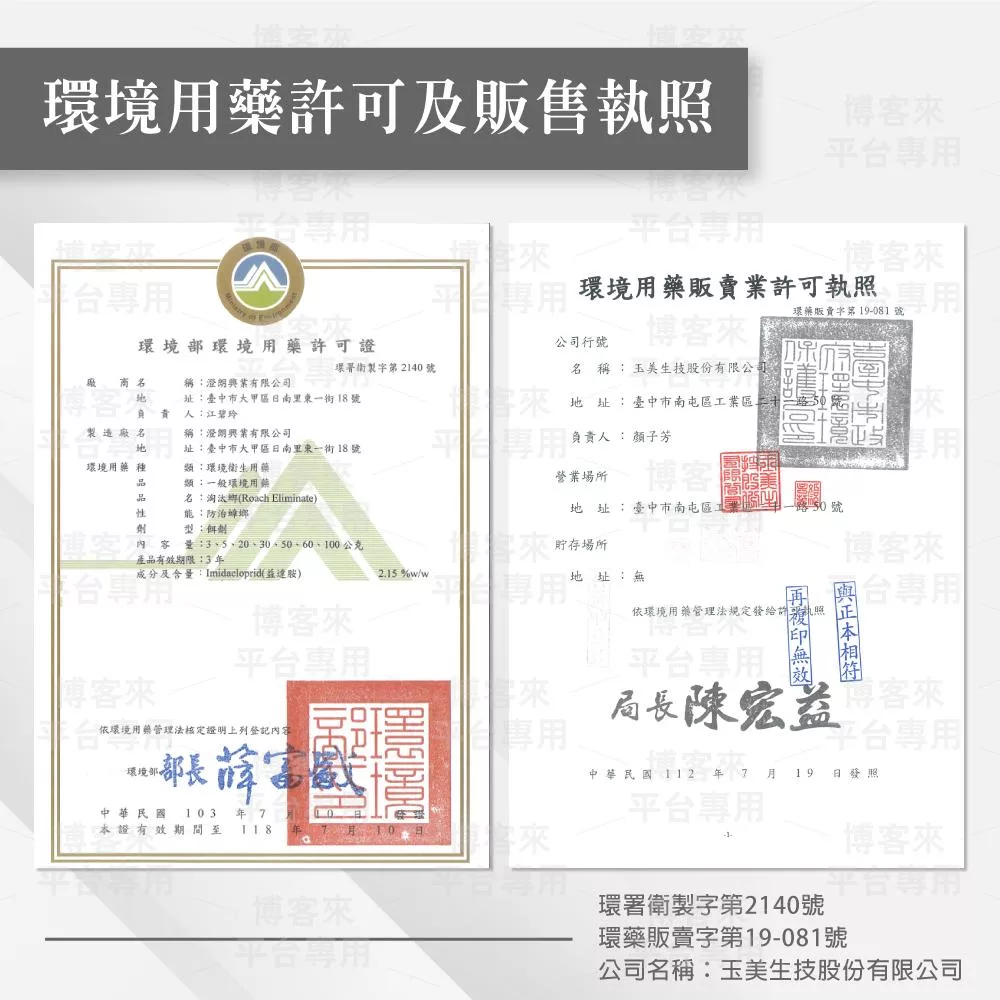 (二)合法環境用藥應有環境用藥許可證字號,可至環保署化學局「環境用藥許可證及病媒防治業網路查詢系統」。