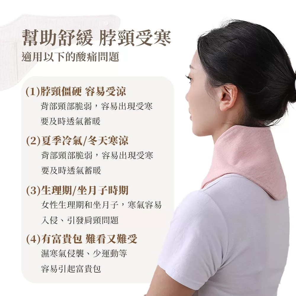 夏天室內防冷氣風吹,冬季後頸口袋設計,可放暖暖包,熱敷後頸更放鬆。