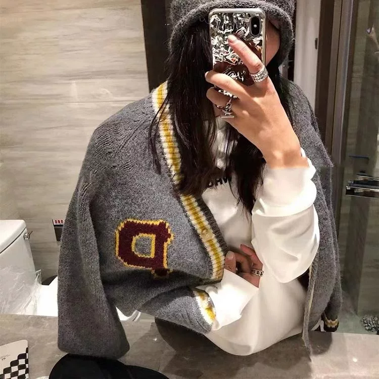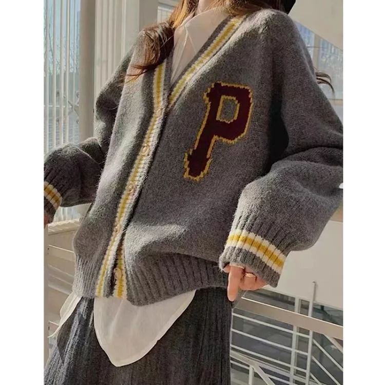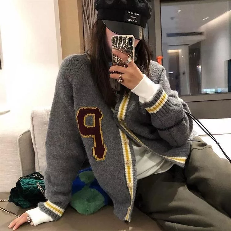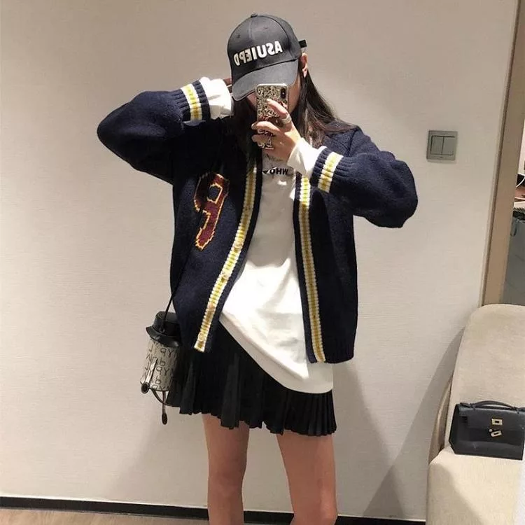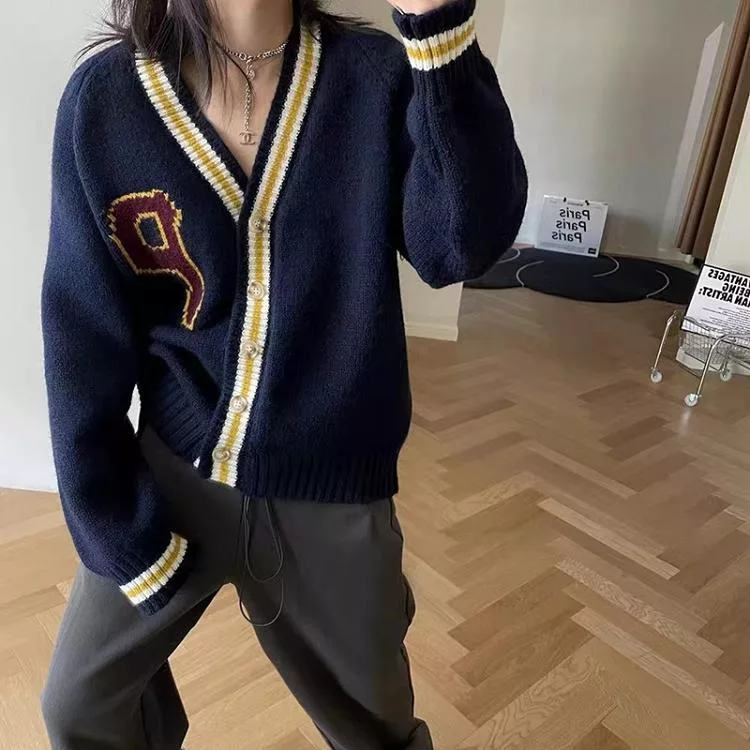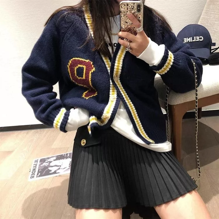 【Jilli~ko】學院風V領休閒寬鬆針織外套女 J12074  FREE 深藍