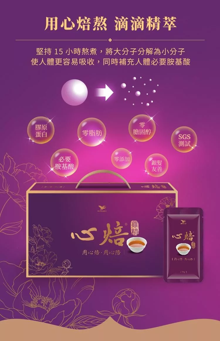 從原料就能感受到的用心,嚴選宮廷進補聖品,複方加持提供多重的滋補,亦讓口感甘潤不膩口。以長達15小時以上的焙熬,萃取雞肉中的營養,以時間醞釀食材的美味精華,讓「心焙」雞精入口帶鮮,尾韻回甘。