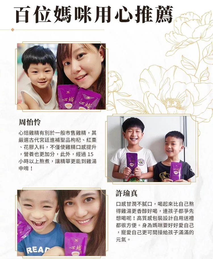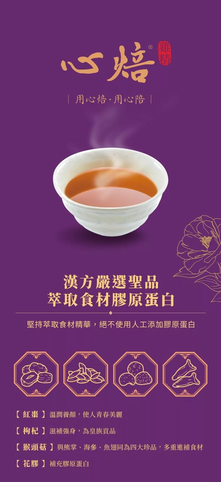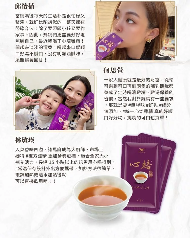 「心焙」象徵品牌的初衷與承諾,從雞隻飼養、農場管理、食材挑選到製程包裝,全程「用心焙,用心陪」,全心全意,只為呈上一盅美味且營養充足的好雞精。