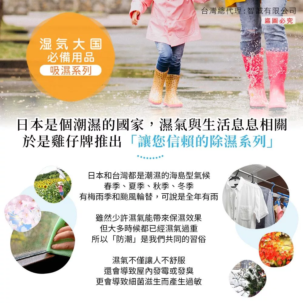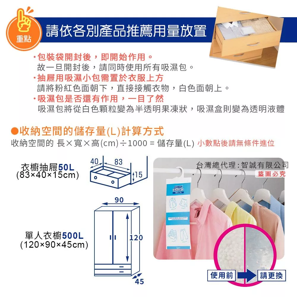 注意事項:本品吸濕量約為100公克x 2入(於室溫25度、濕度為80%的環境中)/請放置於嬰幼兒手無法觸及之處,並避免兒童拿來惡作劇及誤食/本品為吸濕小包,請勿使用於吸濕外的用途/本品非食品,請勿食用/若不慎誤入口中,請立刻吐出並漱口;若不慎吞食,請飲用大量水或牛奶並速就醫/請注意勿滲入眼中。若不慎滲入眼中,請以大量清水沖洗並速就醫/藥劑不慎沾染肌膚、衣物或金屬製品等以及本品破裂時,請盡速洗淨/取出或更換本品時,請勿弄破外層袋。若外層袋有破裂,請勿使用,以免藥劑外漏污染衣物或造成皮製品變質/本品之吸濕面(白色面)請勿弄髒或弄濕,以免造成內容物的藥劑外漏。