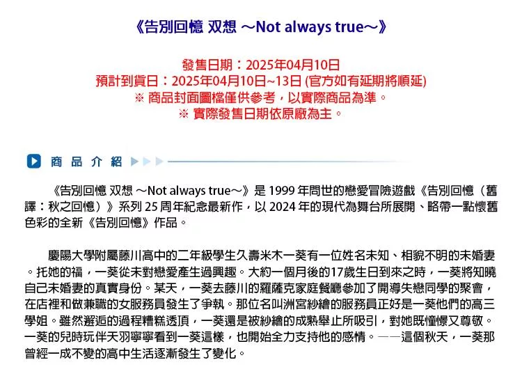 任天堂《告別回憶 双想 ~Not always true~》中文版 ⚘ Nintendo Switch ⚘ 台灣代理版