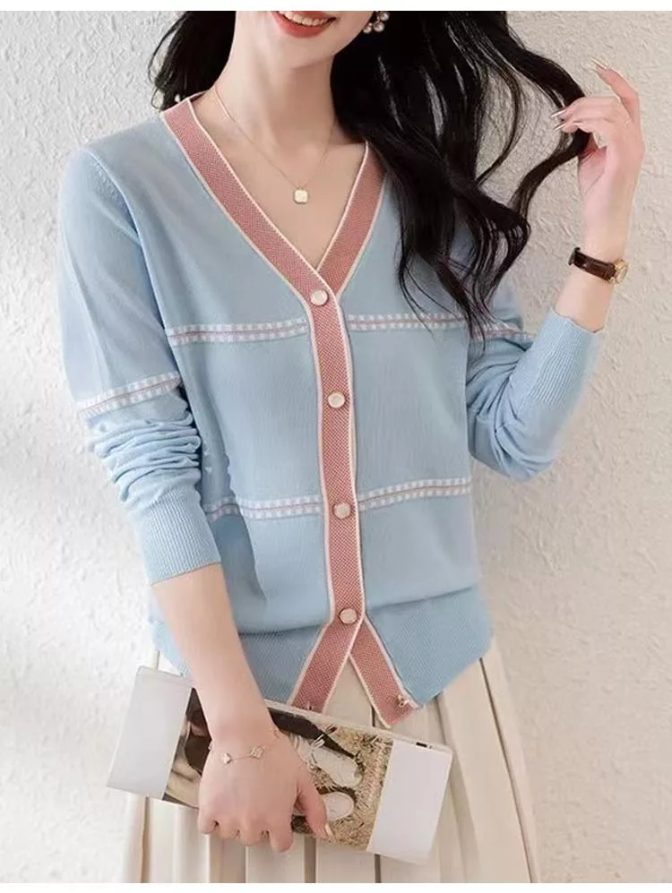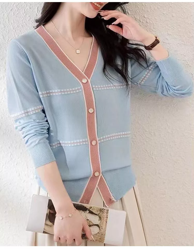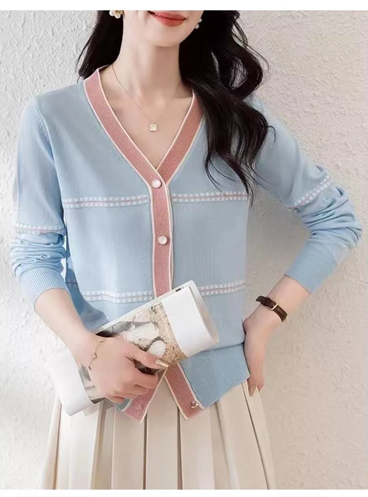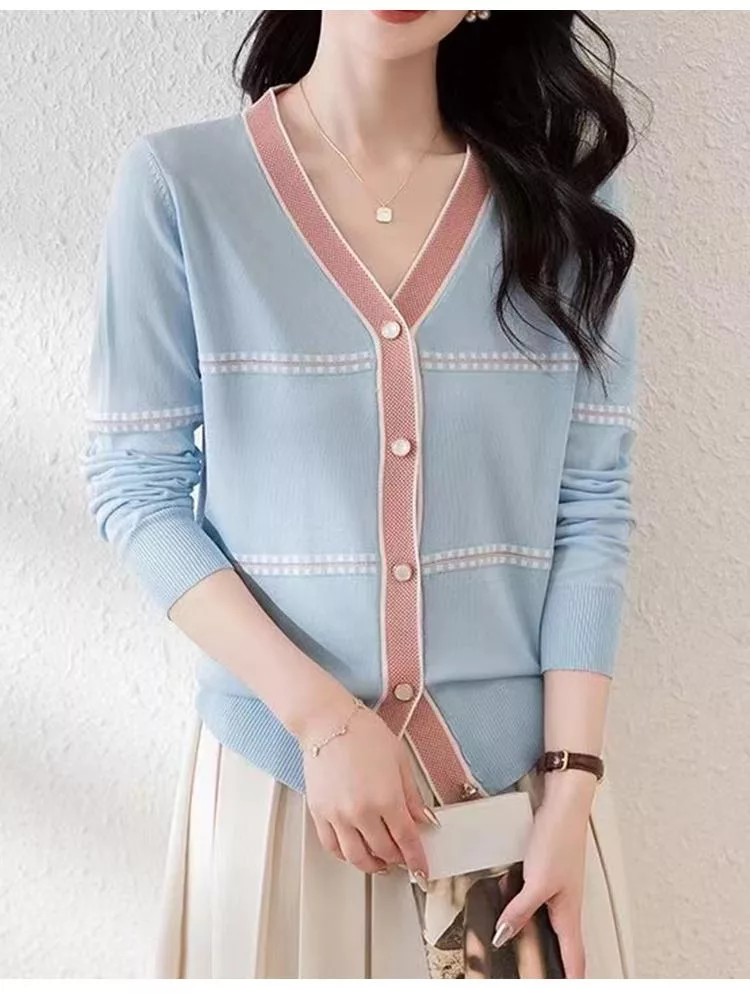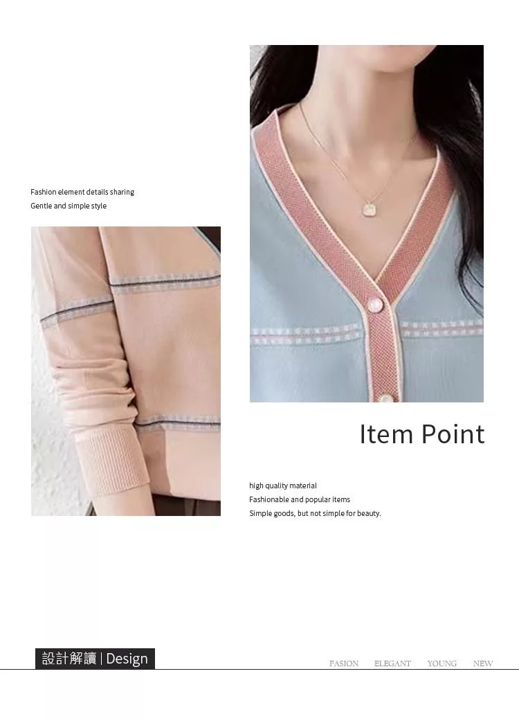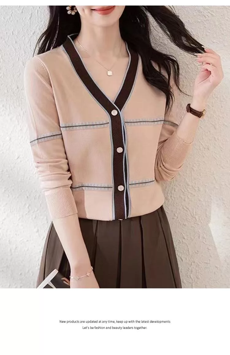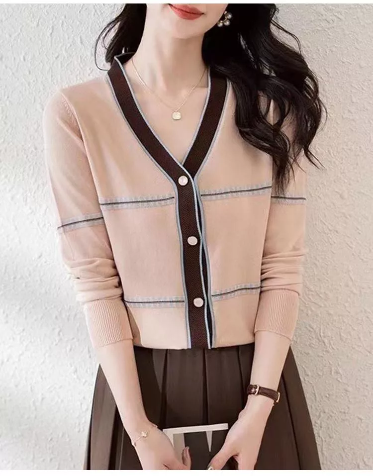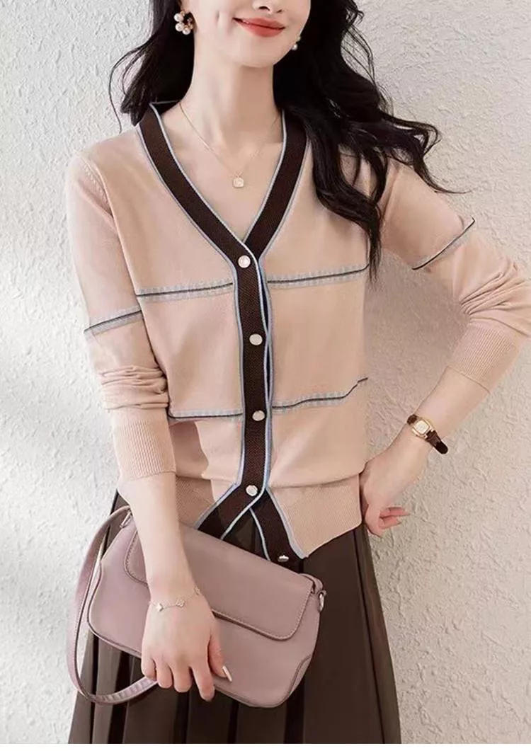 【初色】法式撞色縫線條紋拼接V領顯瘦單排釦長袖針織衫上衣女上衣-共2色-37287(F可選) F 杏色