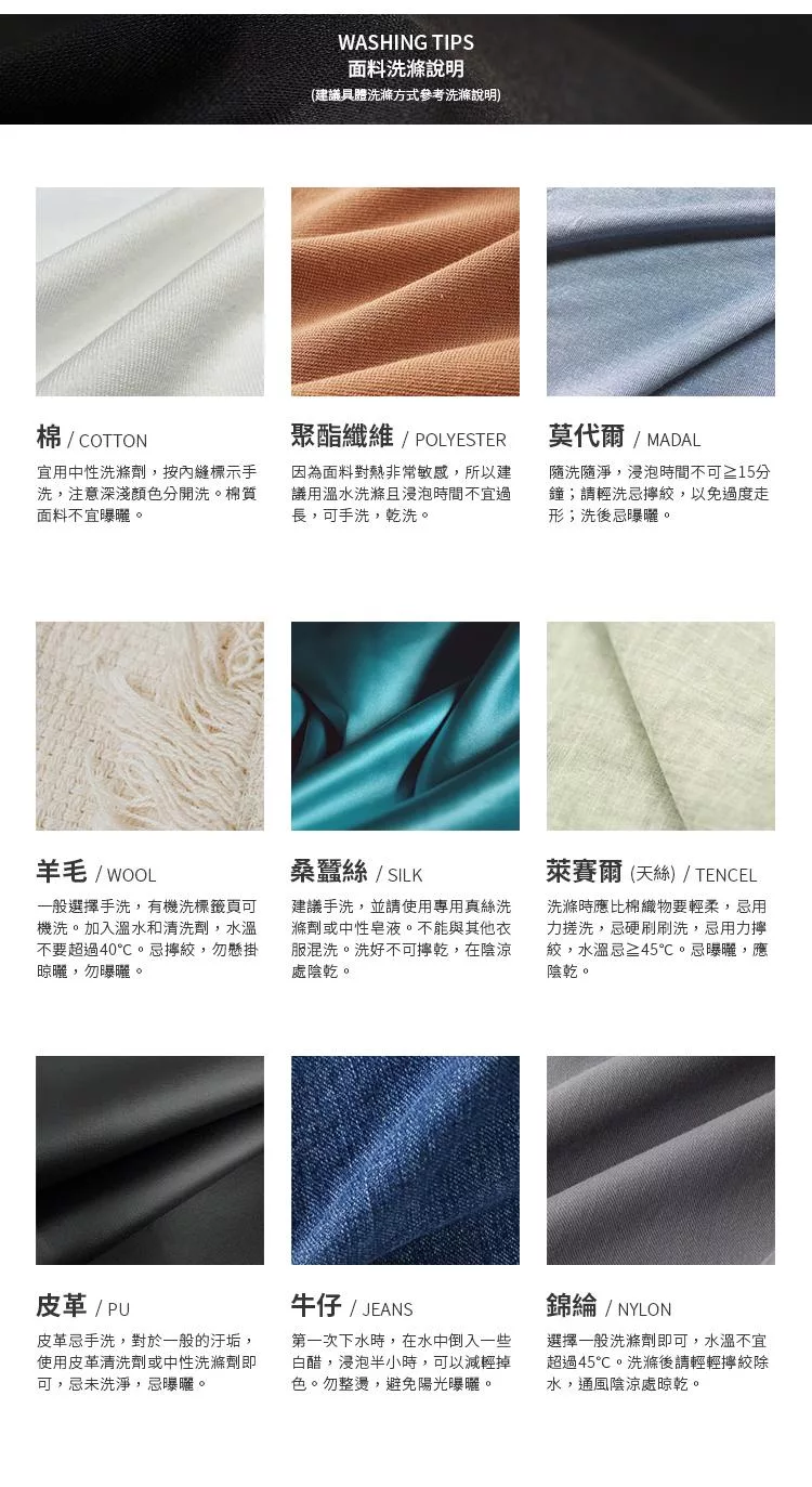 ●可水洗晾乾,不能使用冷洗精、柔軟精及漂白水,不能乾洗