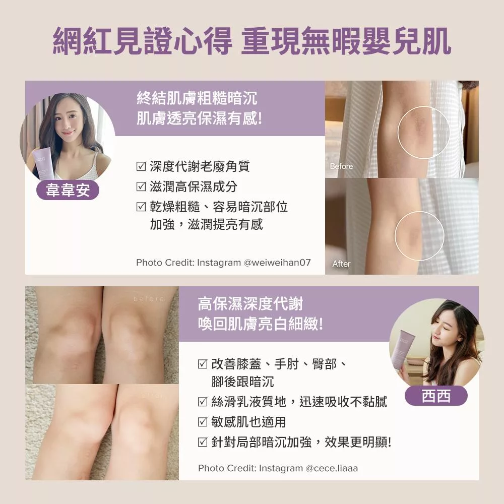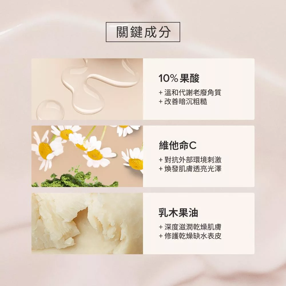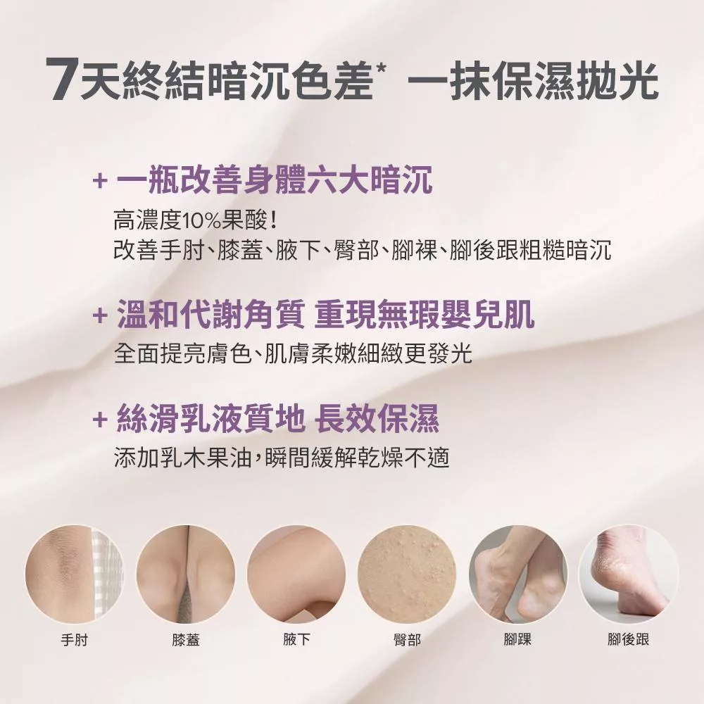 蘊含10%果酸的寶拉珍選10%果酸身體乳液,可以幫助肌膚溫和去除老廢角質,改善手肘膝蓋、腋下、屁股蛋的暗沉與膚色不均,終結腳踝、腳跟的粗糙膚觸;配方添加乳木果油,在去角質同時達到保濕乾燥肌膚的清透潤澤效果,更含有多種抗氧化成分與維他命C,可全方位提升整體肌膚明亮度,打造光滑透亮的細緻肌膚。