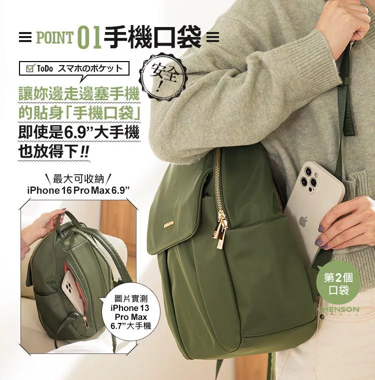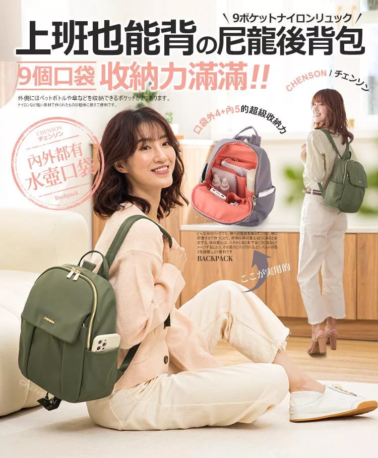 CHENSON 尼龍9口袋 媽媽包 後背包附水壺固定內口袋 (CG85110-G) 綠