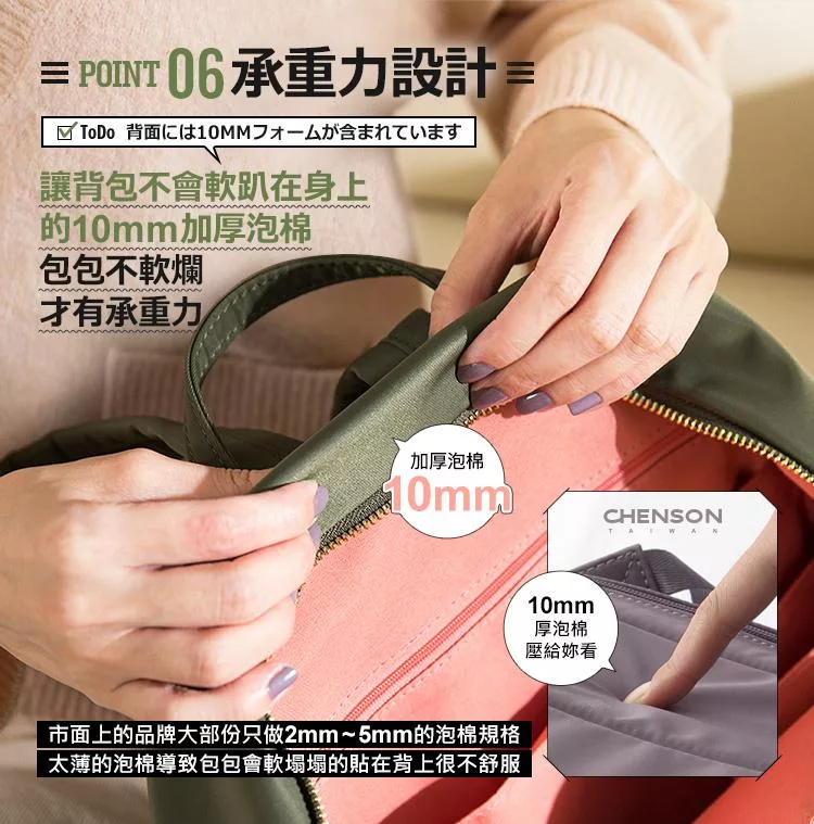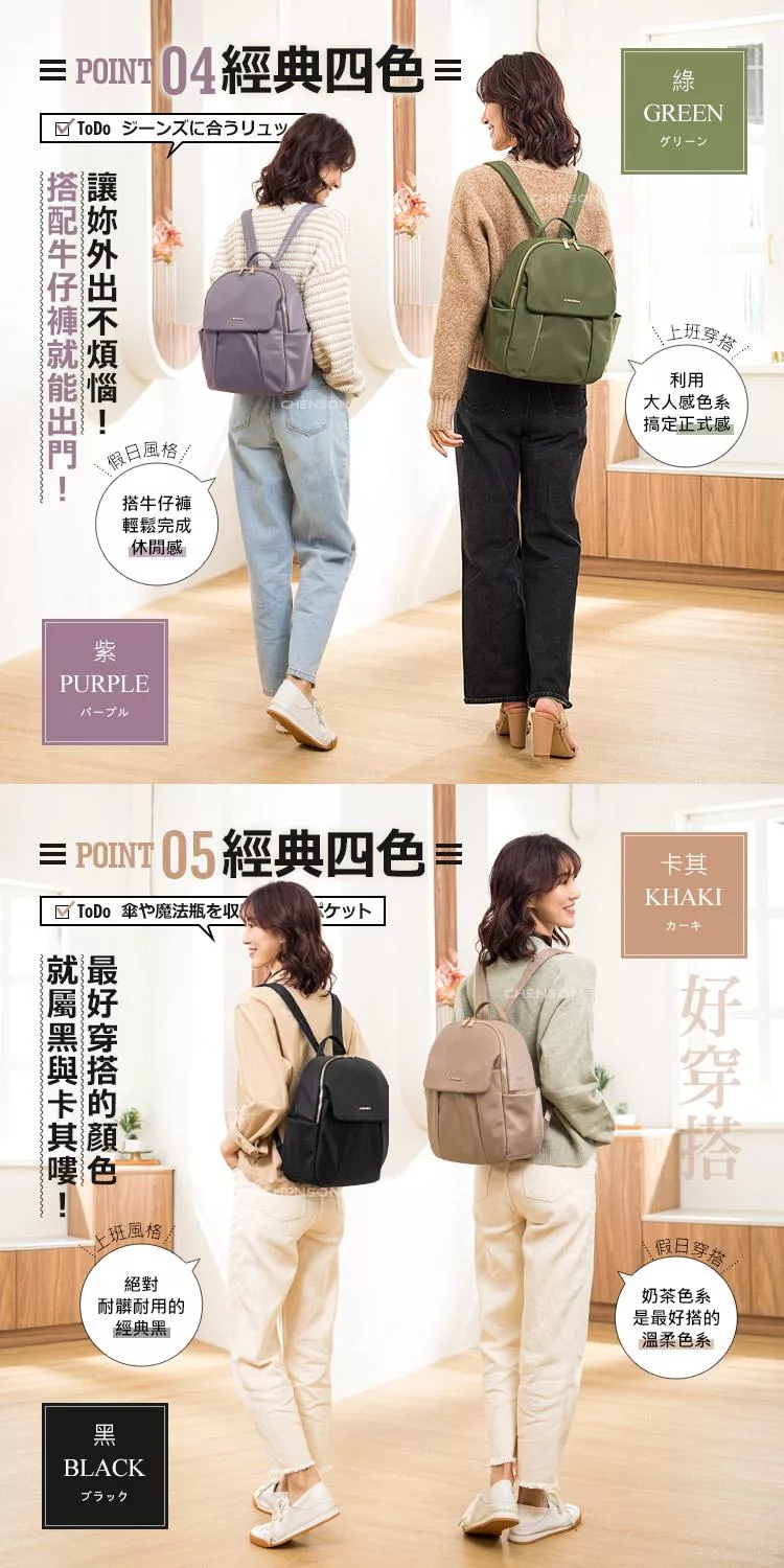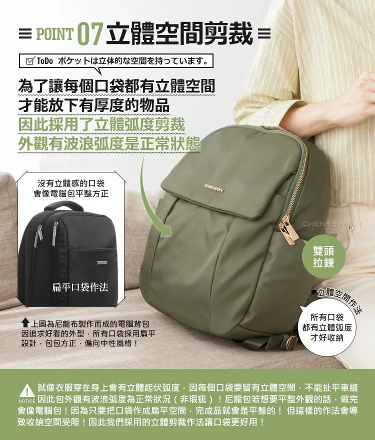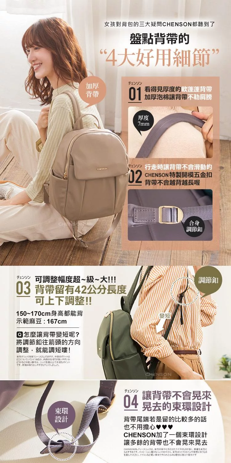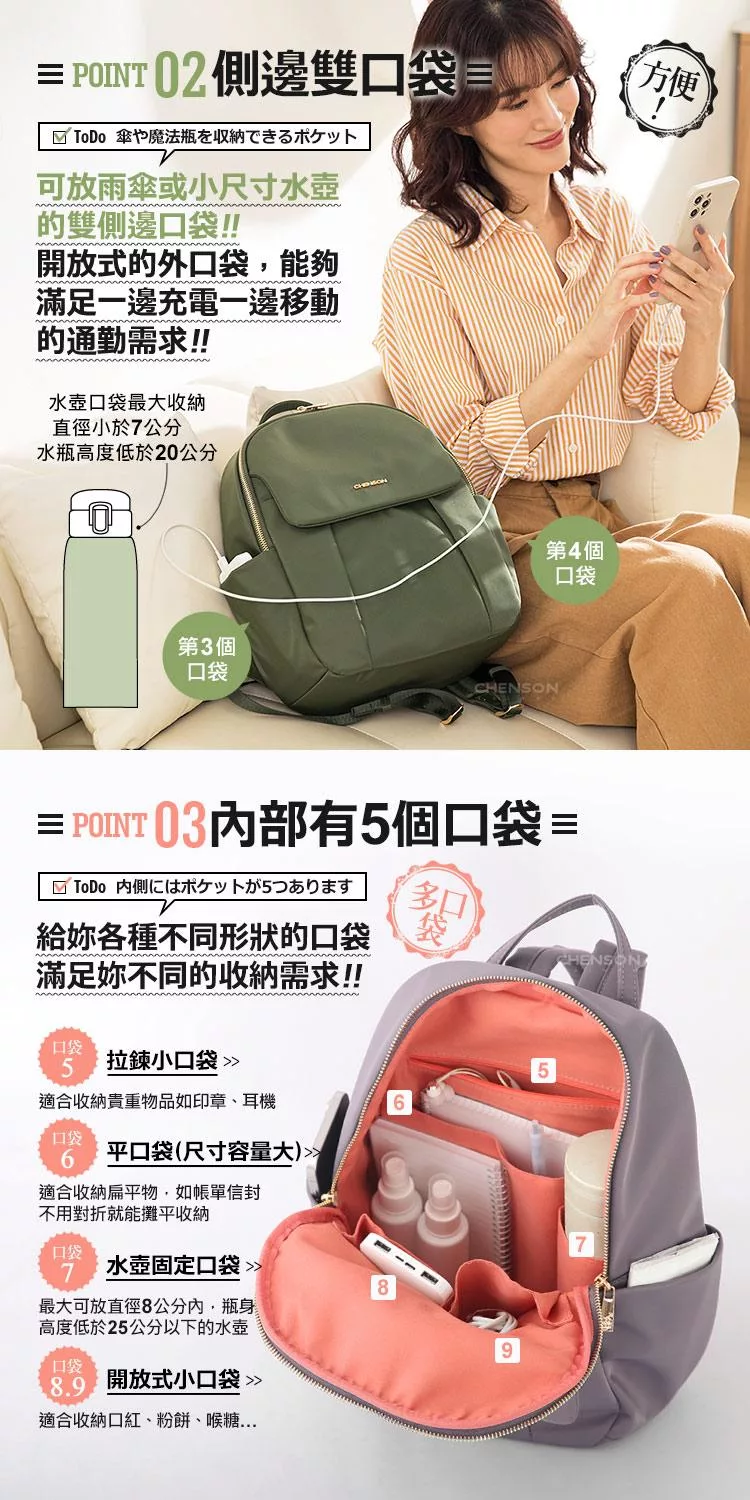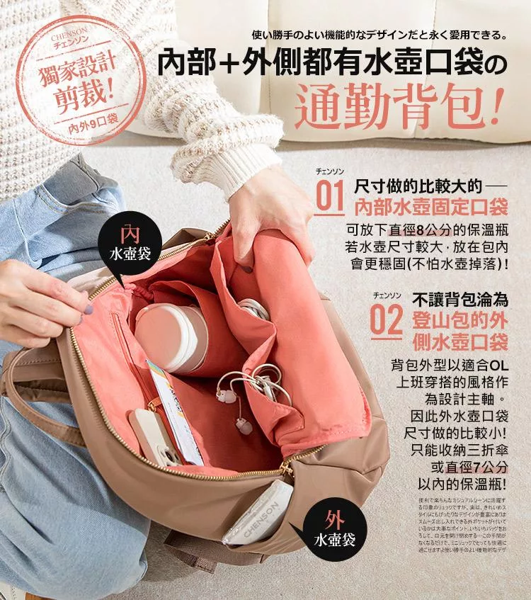 CHENSON 尼龍9口袋 媽媽包 後背包附水壺固定內口袋 (CG85110-K) 卡其杏