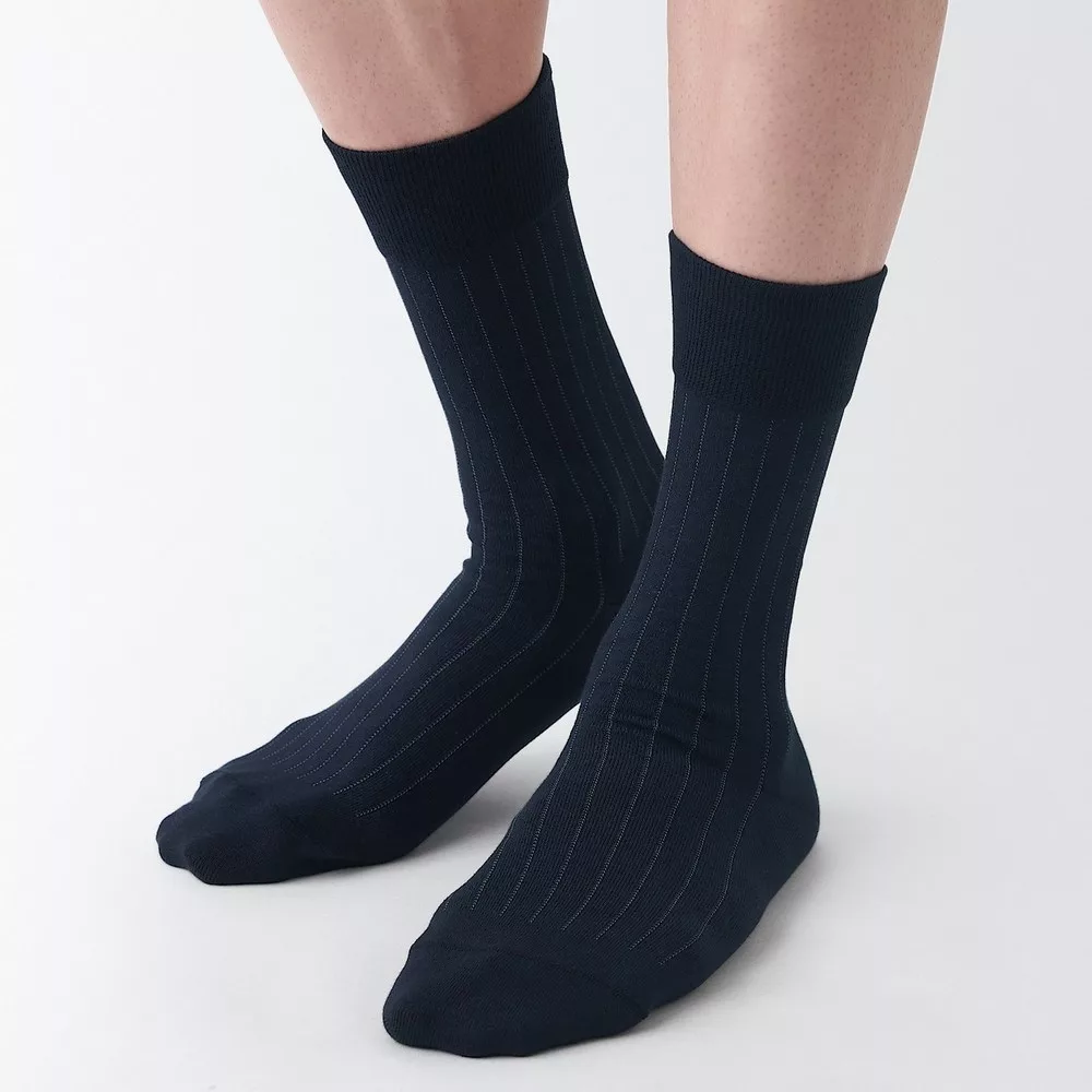 【MUJI 無印良品】男圈絨直角襪25-27cm 深藍直紋