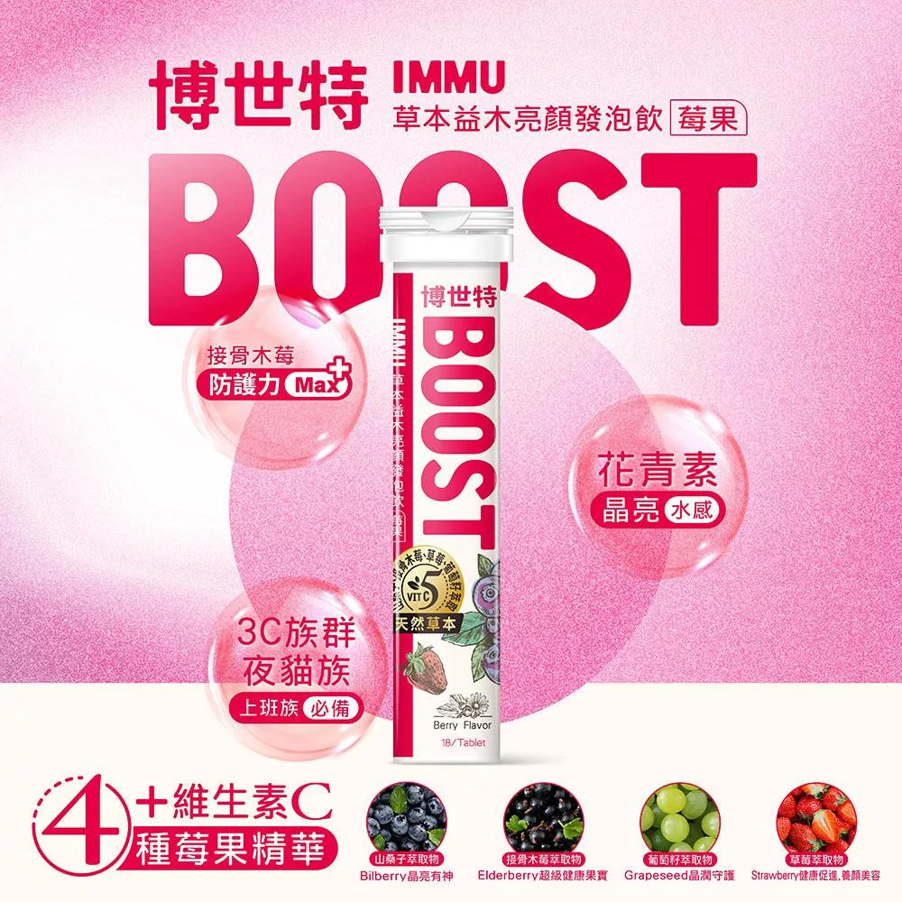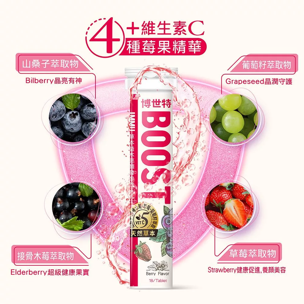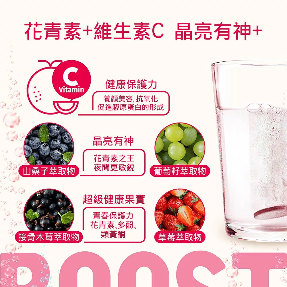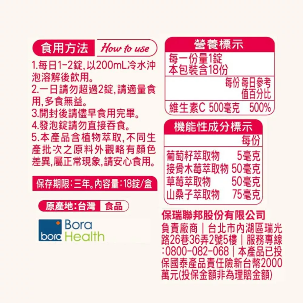 碳酸氫鈉、酒石酸、檸檬酸、D-山梨醇、抗壞血酸(維生素C)、檸檬酸鈉、聚乙二醇、草莓香料粉【麥芽糊精、辛烯基丁二酸鈉澱粉、草莓香料、脂肪酸甘油酯、維生素E(抗氧化劑)】、山桑子萃取物、接骨木莓萃取物、草莓萃取物、醋磺內酯鉀(甜味劑)、蔗糖素(甜味劑)、葡萄籽萃取物