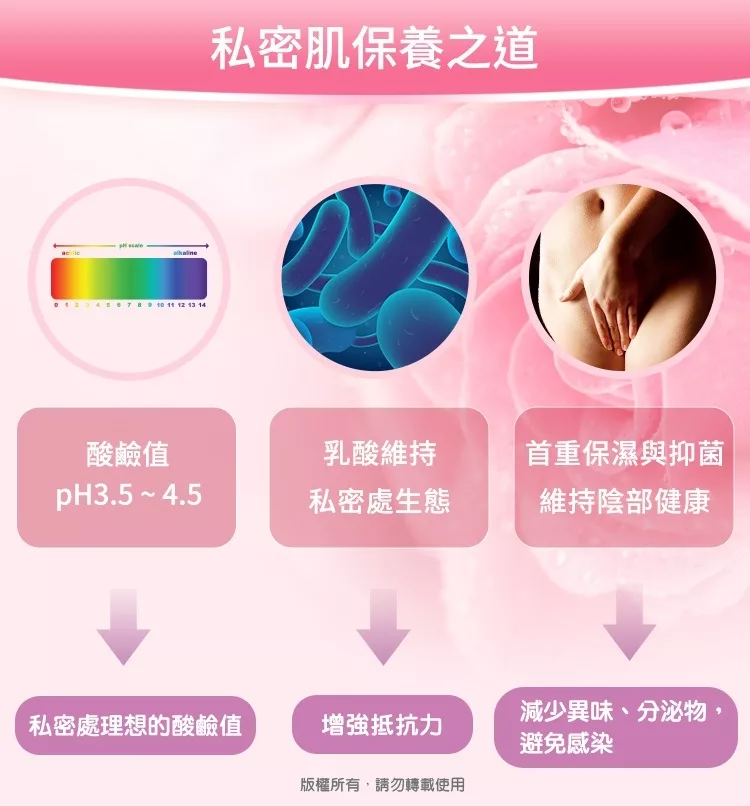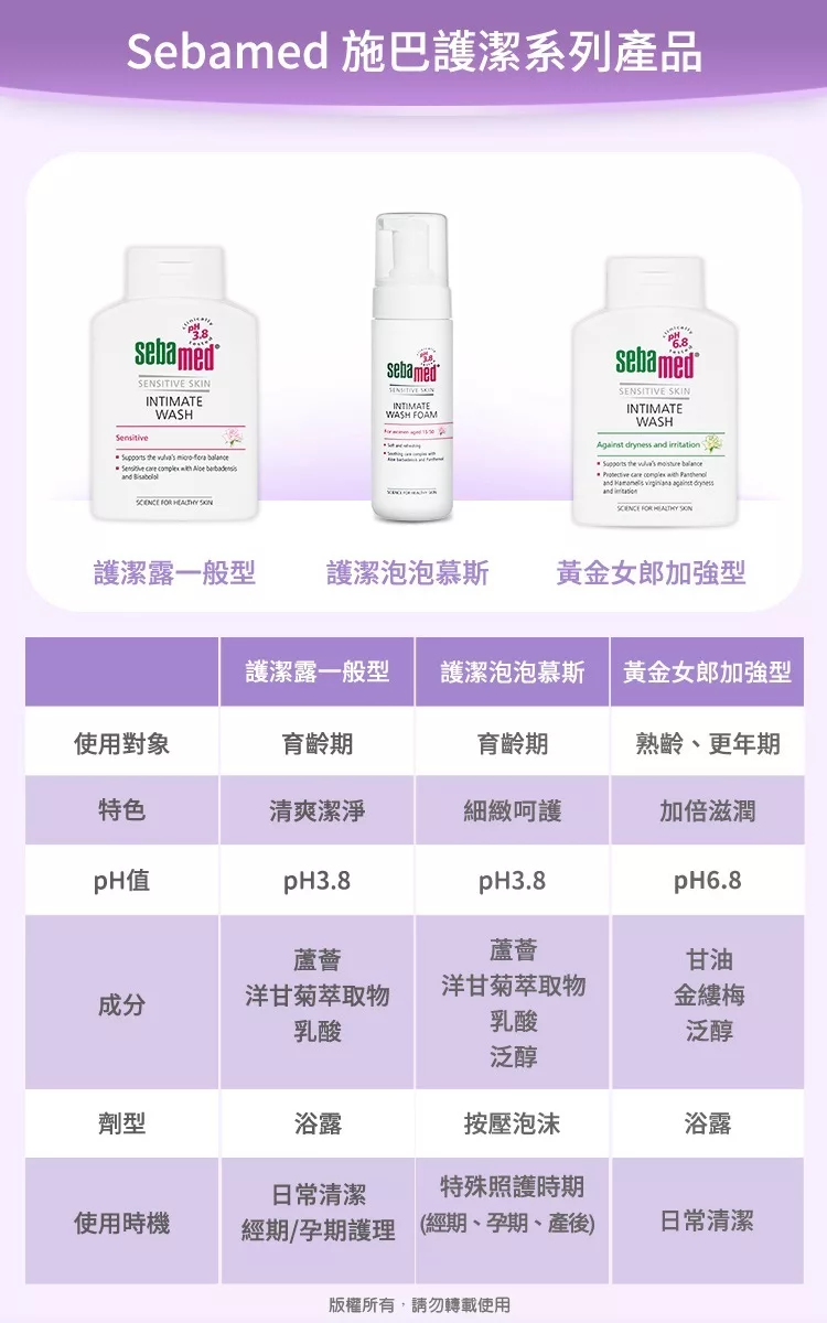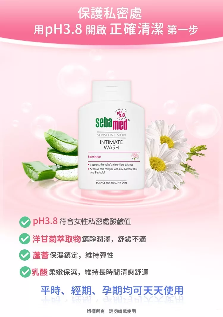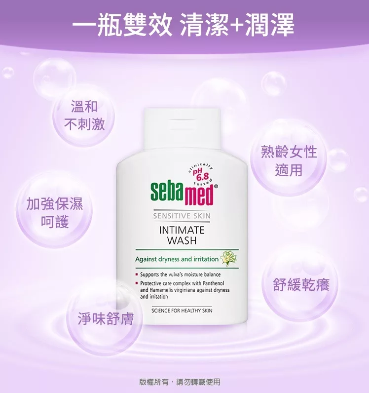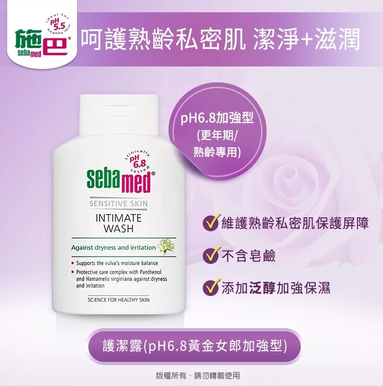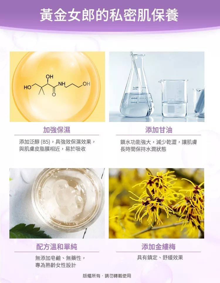 不含皂鹼,符合熟齡私密肌膚酸鹼值、添加金縷梅、泛醇(B5)等保濕成分,打造私密肌健康平衡生態。