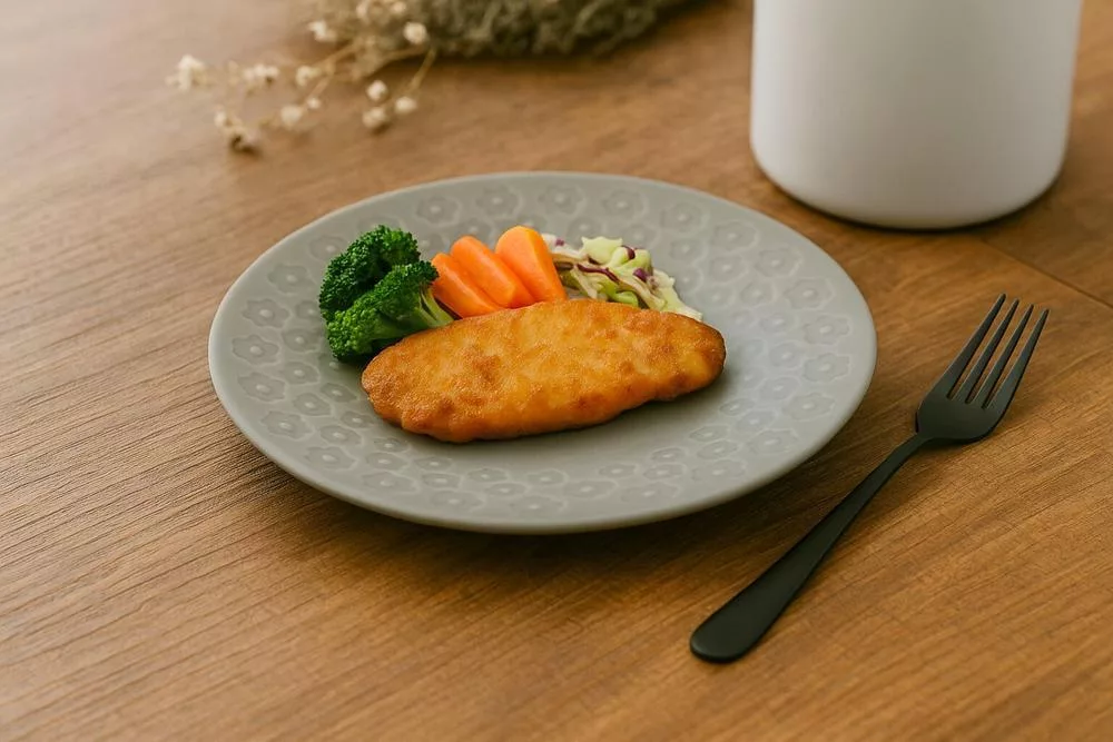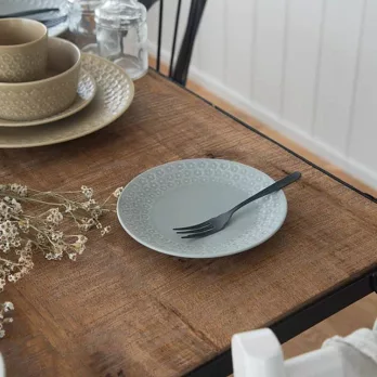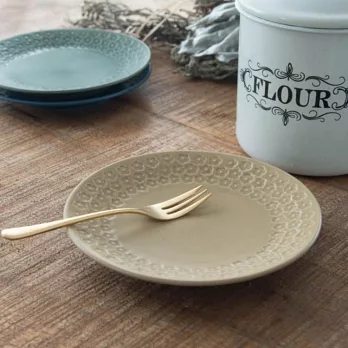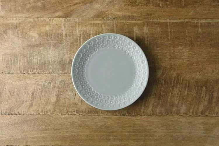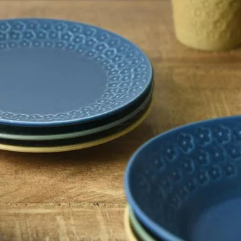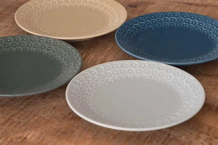 以日本美濃燒工藝製成,餐盤邊緣環繞著細緻的花卉浮雕,