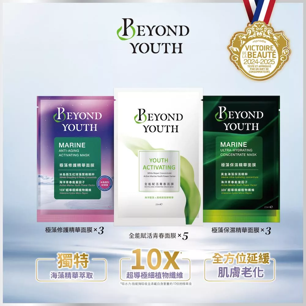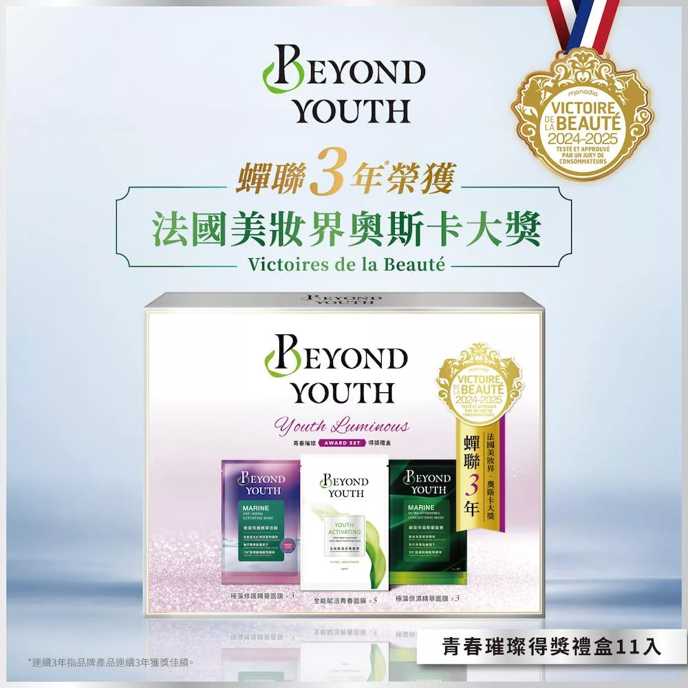 歡慶青春面膜上市即獲獎的殊榮,同時品牌極藻保濕款面膜,連續三年榮獲大獎,亦代表品牌連續三年獲獎佳績,因應得獎推出全新禮盒。