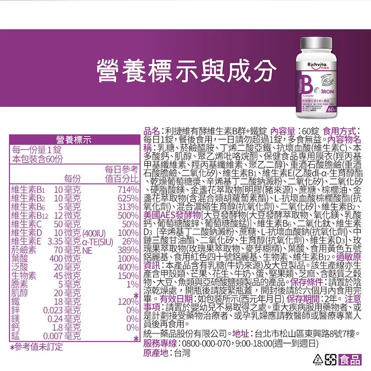 【Richvita利捷維】有酵維生素(60錠) B群+鐵EX錠X3