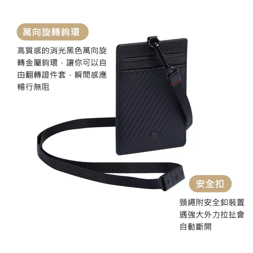 360 度萬向鉤環讓掛繩與證件套不易糾結,即使頻繁取用卡片或轉動頸繩,也能保持順暢不打結,提升日常使用的便利性。