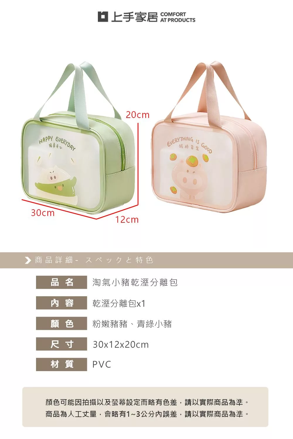 ◆商品名稱:淘氣小豬乾溼分離包(盥洗包/洗漱包/防水收納袋/透明包/旅行收納包/游泳包/防水化妝包)