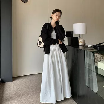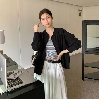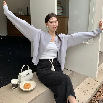 圓鈕釦簡約剪裁.修飾圓領.小收袖.寬收腰微短下擺