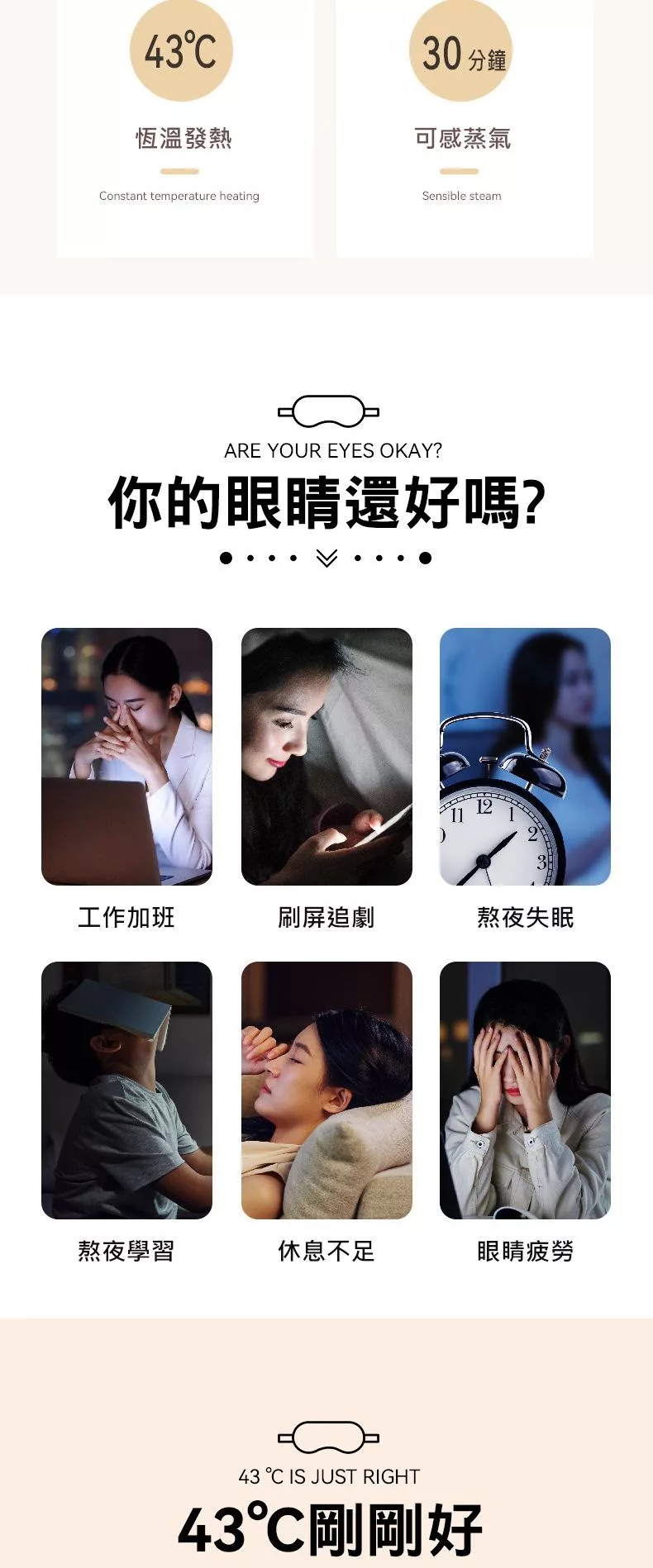 持續恆溫43°C,可維持約30分鐘 使眼睛放鬆疲勞