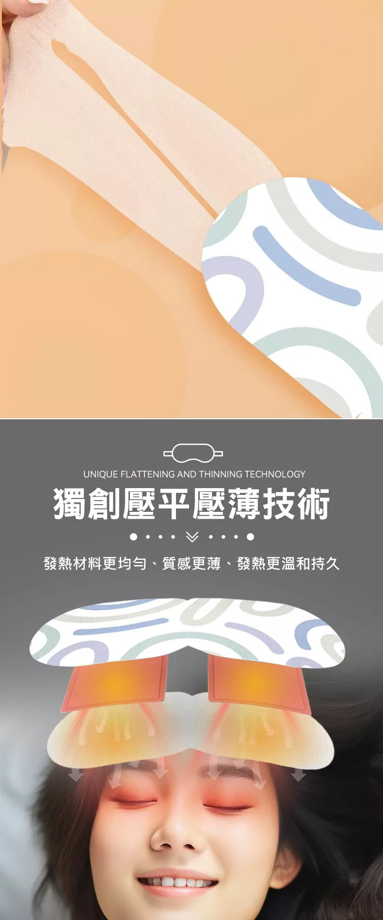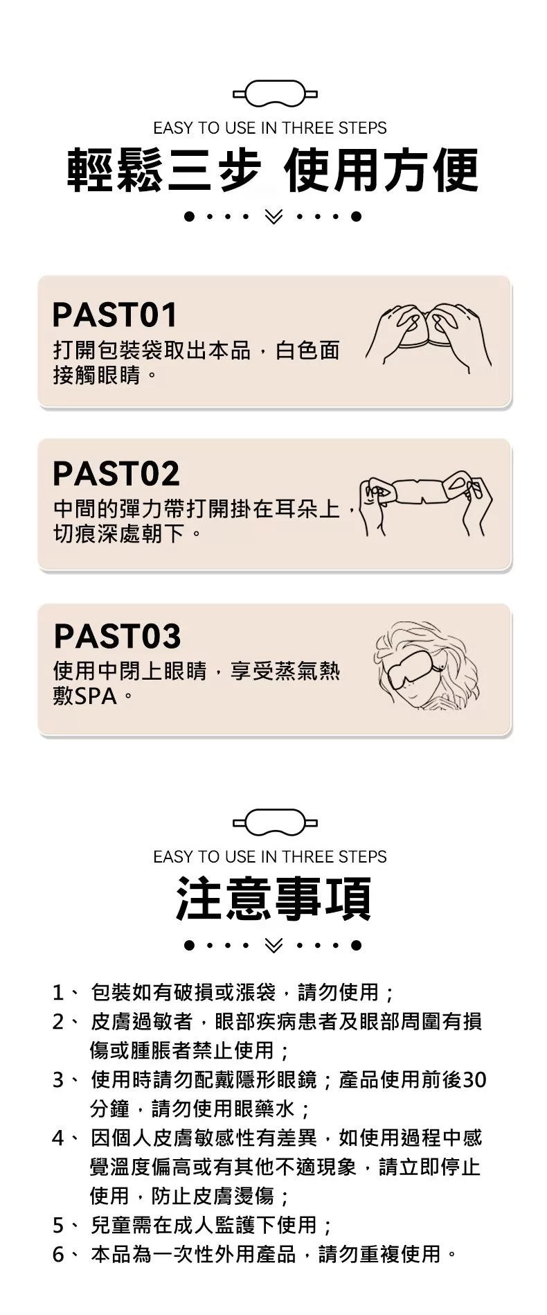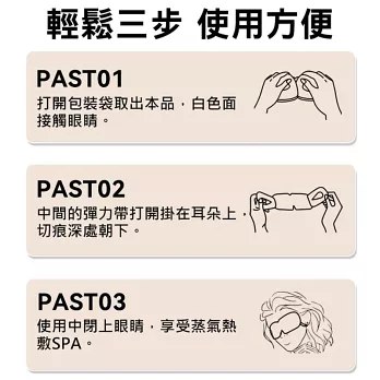 功能:蒸汽薰蒸、恆溫熱敷、滋潤眼部肌膚、緩解眼部疲勞、睡眠遮光