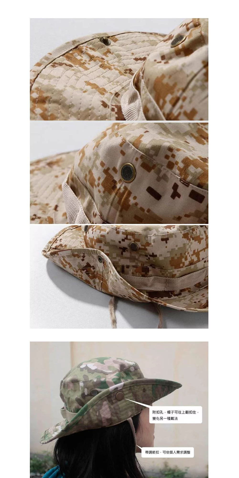 ◎帽子兩側有扣孔,可將帽子翻起扣合,變化另一種戴法