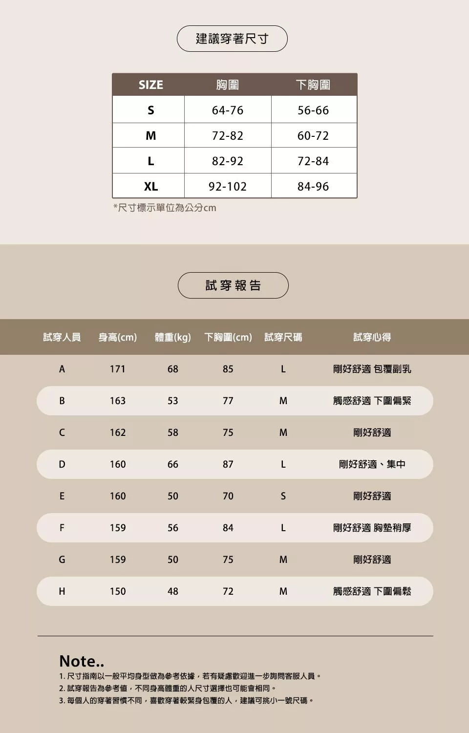 S-L為上薄下厚罩杯;XL為全薄罩杯