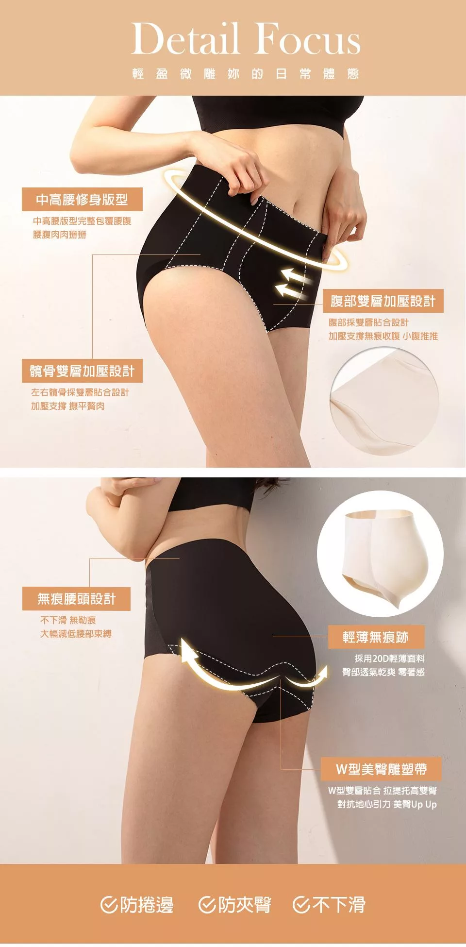 .微體雕塑 包覆腰間肉:腹部/髖骨採雙層貼合設計,20D加壓支撐無痕收腹