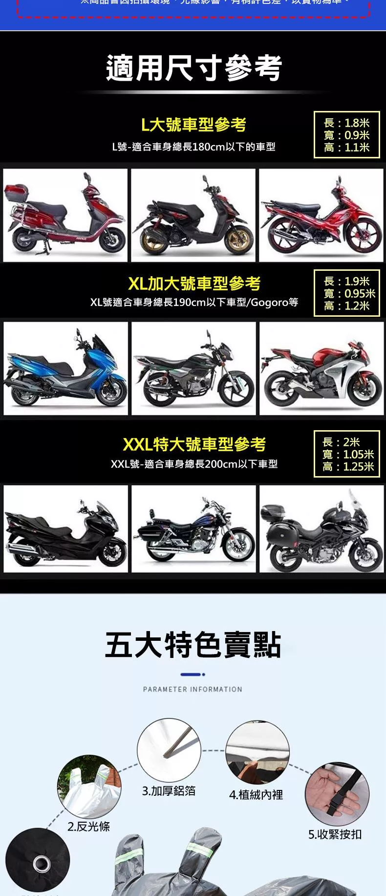 XXL號:200*105*125cm,適合車身總長200cm以下車型(125cc以上車型)
