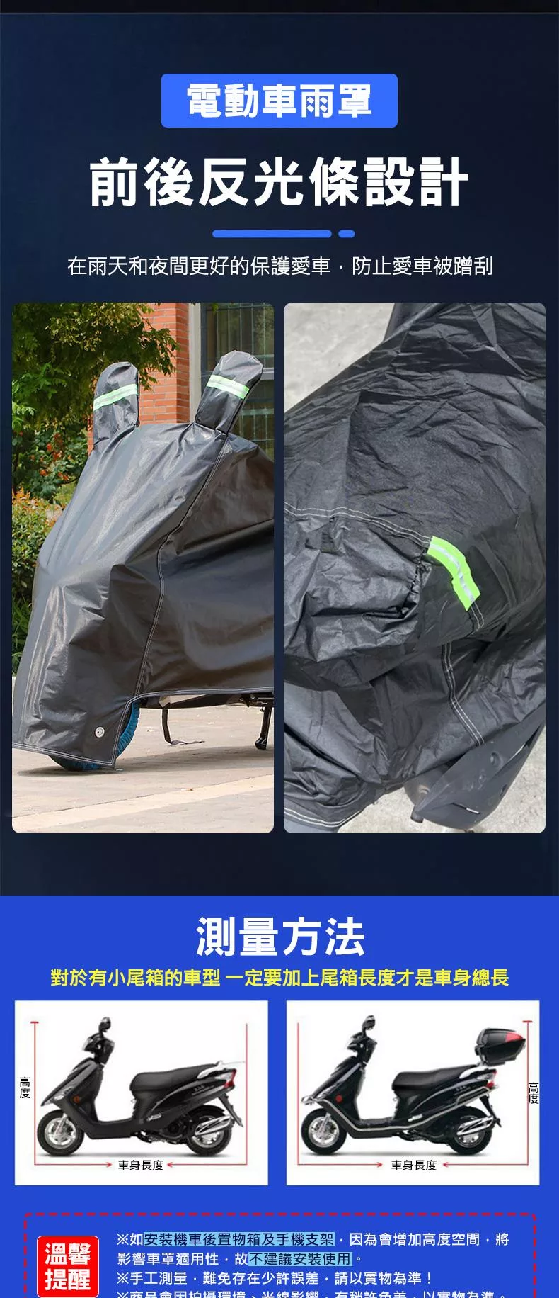 如安裝機車後置物箱及手機支架,因為會增加高度空間,將影響車罩適用性,故不建議安裝使用。