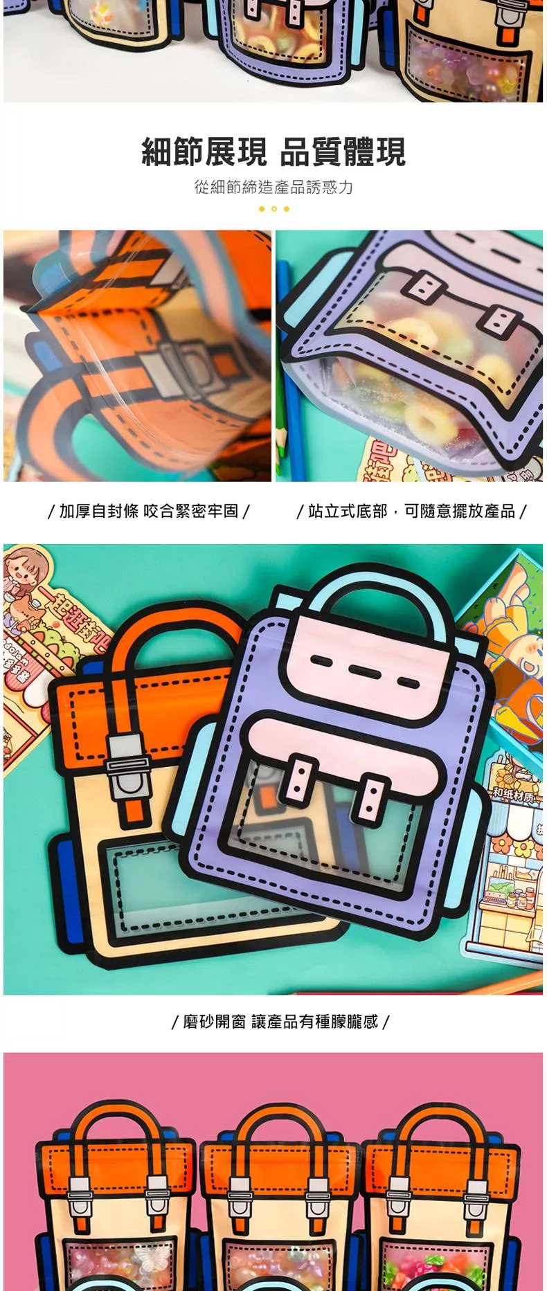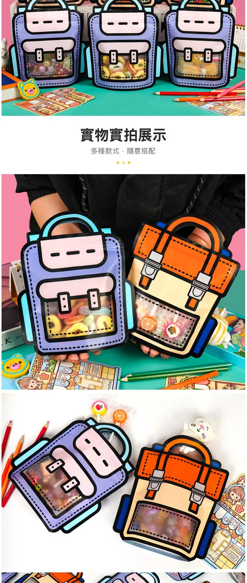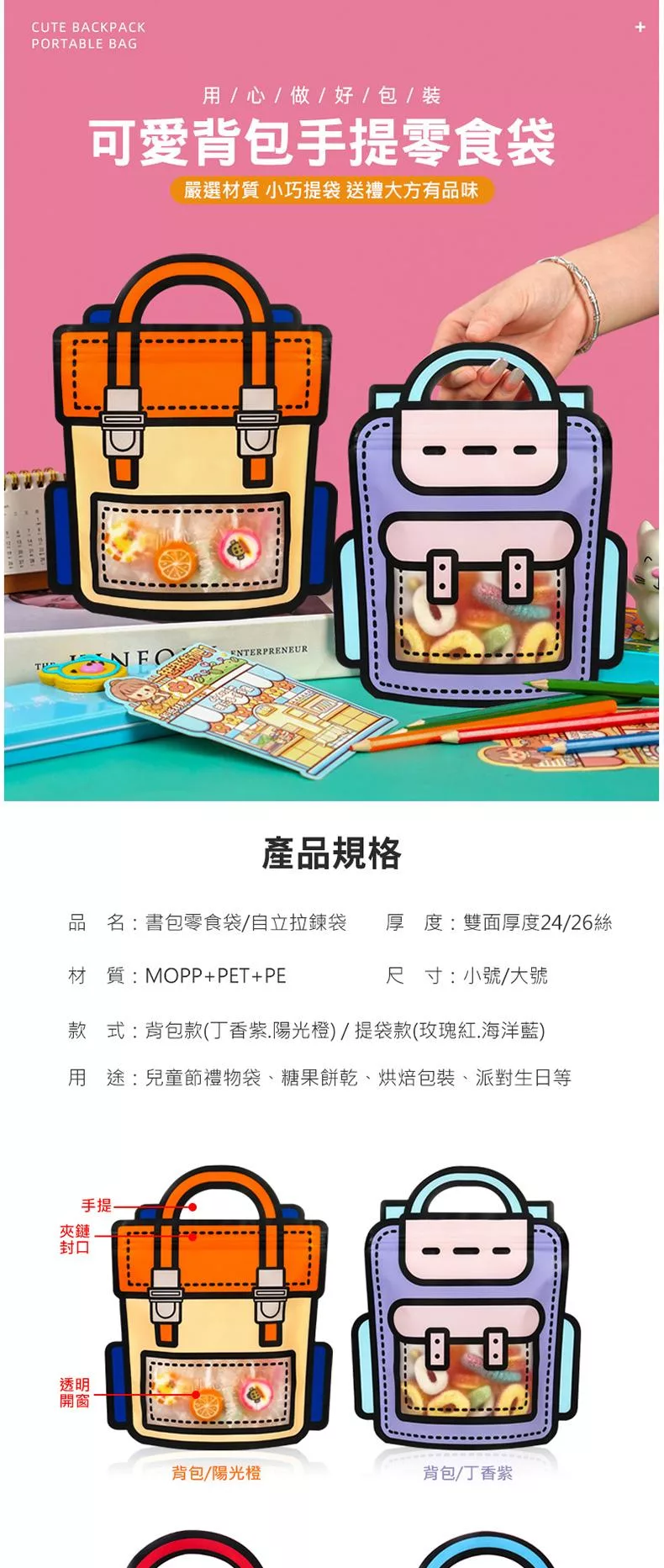 可愛背包手提零食袋 書包零食袋 背包/書包造型 手提自立袋 自立拉鍊袋 自封條 零食包裝袋 零食禮物袋