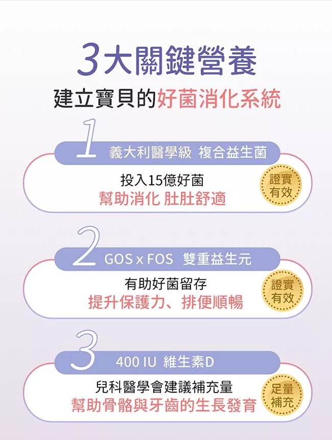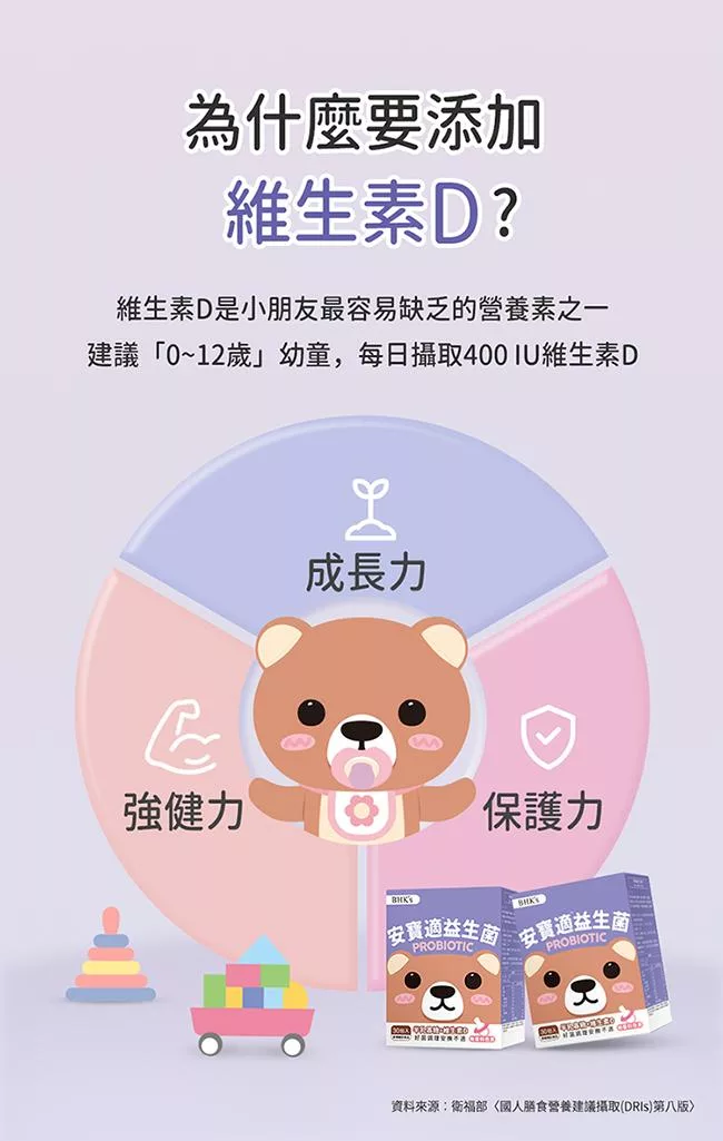 400IU足量補充,嬰幼兒成長關鍵營養;增進鈣吸收,幫助骨骼與牙齒的生長發育。