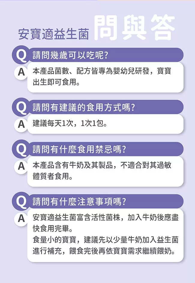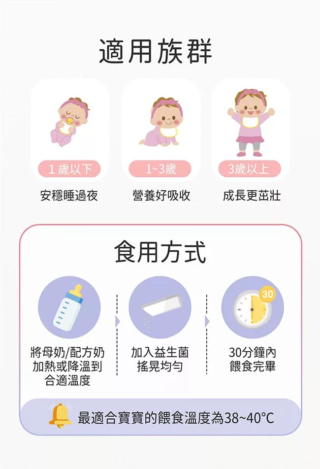 可安全用於新生兒與幼童的益生菌,推薦「剛出生~2歲」的寶寶食用。