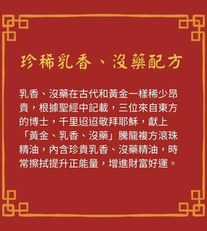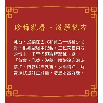 乳香、沒藥,意味著尊貴榮耀與珍貴價值,乳香在古代和黃金一樣珍貴,是極貴重的香膏,溫暖深沈的木質調香氣,代表神聖生命清香,行走之地留下香氣;沒藥則是古代作為藥材、祭祀及供品中使用,兩者皆有神聖意涵。