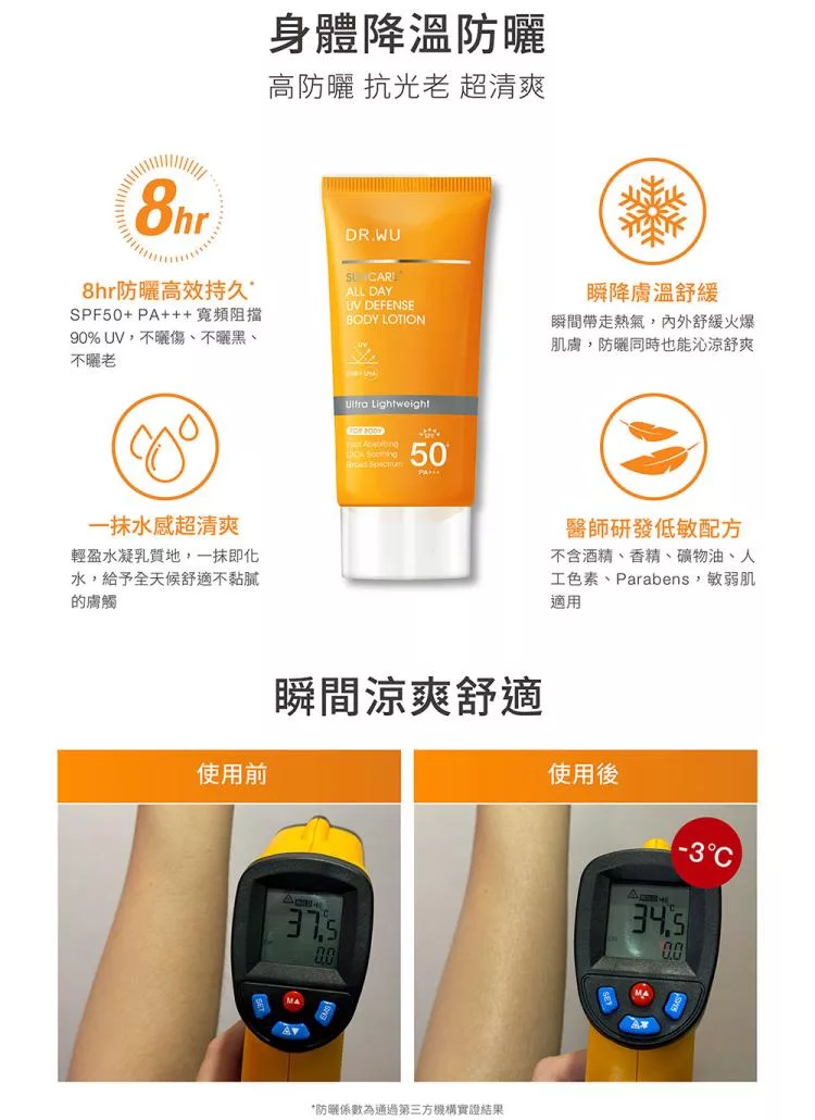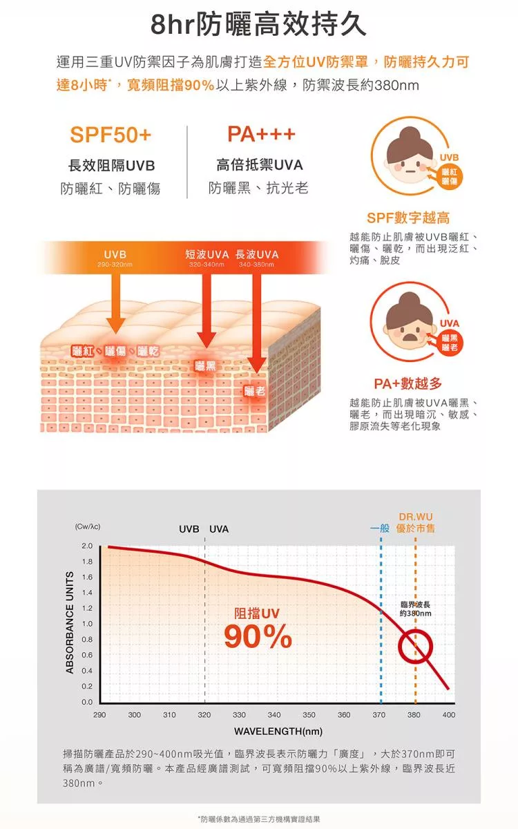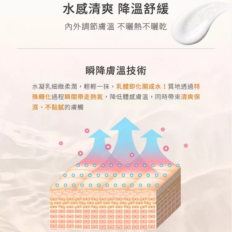 清爽水凝乳質地,一抹即化水,給予肌膚清新舒爽、保濕不黏膩的觸感。運用光穩定廣譜防禦機制,長效抵禦紫外線UVA及UVB,預防曬黑及曬老,結合積雪草萃取與五重玻尿酸,鎮 靜舒緩肌膚,同時補水保濕,預防曝曬後的泛紅及乾燥不適,幫助穩定膚況,實現外防禦、內修護的全方位防曬效果。 全配方不含酒精、香精、人工色素、Paraben類防腐劑,質地清爽無負擔,不悶膚、不黏膩,醫 美術後、敏感肌人群也適用。