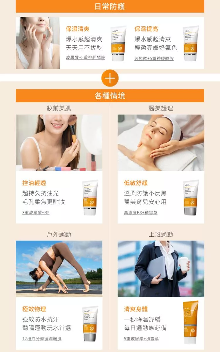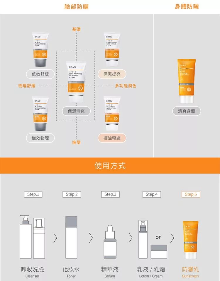 使用步驟:卸妝、清潔→化妝水→精華液→乳液面霜→防曬隔離