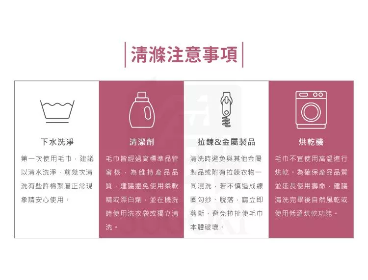 3.請勿使用漂白劑、含螢光成分等洗衣精,以免破懷毛巾色澤、纖維等,水溫不超過40度。
